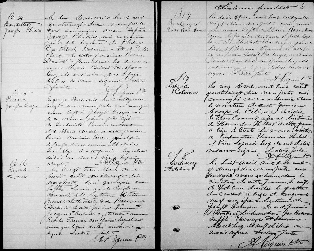 Cette série regroupe les registres originaux de l'état civil, lesquels contiennent les enregistrements de baptêmes, de mariages et de sépultures consignés par le curé ou son représentant au cours de la période concernée par les documents.Outre les renseignements à caractère généalogique que nous pouvons y puiser, cette série peut constituer une source documentaire importante pour toute étude-statistique ou comparative sur les conditions de vie à différentes époques (mortalité infantile, espérance de vie) ou pour toute recherche portant sur l'occupation des terres (lieu de résidence), sur le mode de vie (métiers et professions, statut et âge des époux), sur les classes sociales (titres des parties impliquées, témoins/amis/parents présents lors d'un mariage), sur des évènements spéciaux (quelques mentions dans les sépultures) et sur des sujets à incidence médicale tels les maladies héréditaires (cause du décès)