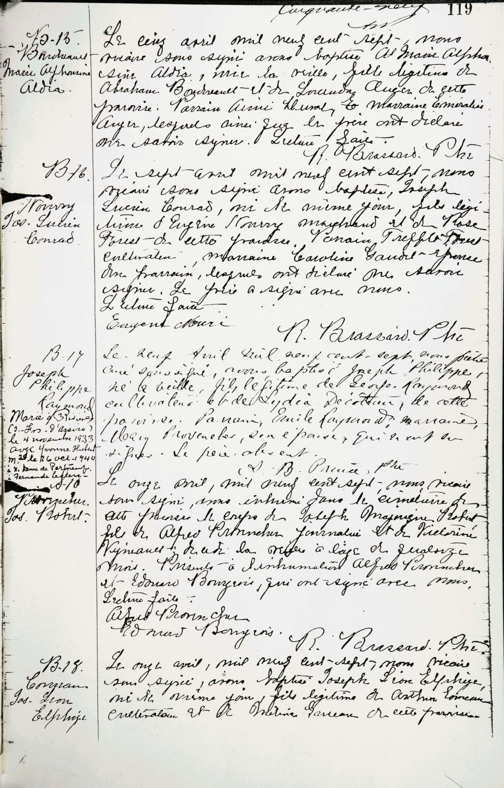 - Cette série regroupe les registres originaux de l'état civil, lesquels contiennent les enregistrements de baptêmes, de mariages et de sépultures consignés par le curé ou son représentant au cours de la période concernée par les documents.Outre les renseignements à caractère généalogique que nous pouvons y puiser, cette série peut constituer une source documentaire importante pour toute étude-statistique ou comparative sur les conditions de vie à différentes époques (mortalité infantile, espérance de vie) ou pour toute recherche portant sur l'occupation des terres (lieu de résidence), sur le mode de vie (métiers et professions, statut et âge des époux), sur les classes sociales (titres des parties impliquées, témoins/amis/parents présents lors d'un mariage), sur des évènements spéciaux (quelques mentions dans les sépultures) et sur des sujets à incidence médicale tels les maladies héréditaires (cause du décès)