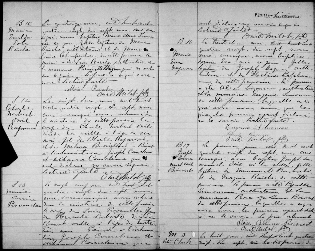 - Cette série regroupe les registres originaux de l'état civil, lesquels contiennent les enregistrements de baptêmes, de mariages et de sépultures consignés par le curé ou son représentant au cours de la période concernée par les documents.Outre les renseignements à caractère généalogique que nous pouvons y puiser, cette série peut constituer une source documentaire importante pour toute étude-statistique ou comparative sur les conditions de vie à différentes époques (mortalité infantile, espérance de vie) ou pour toute recherche portant sur l'occupation des terres (lieu de résidence), sur le mode de vie (métiers et professions, statut et âge des époux), sur les classes sociales (titres des parties impliquées, témoins/amis/parents présents lors d'un mariage), sur des évènements spéciaux (quelques mentions dans les sépultures) et sur des sujets à incidence médicale tels les maladies héréditaires (cause du décès)