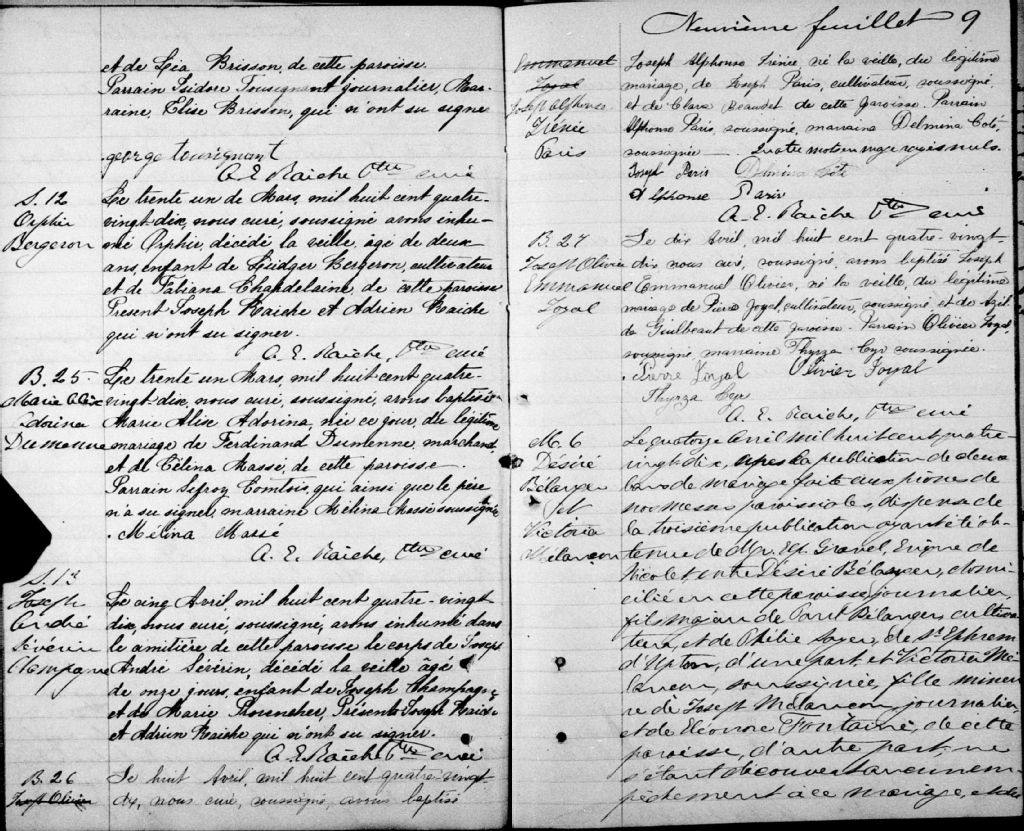 Cette série regroupe les registres originaux de l'état civil, lesquels contiennent les enregistrements de baptêmes, de mariages et de sépultures consignés par le curé ou son représentant au cours de la période concernée par les documents.Outre les renseignements à caractère généalogique que nous pouvons y puiser, cette série peut constituer une source documentaire importante pour toute étude-statistique ou comparative sur les conditions de vie à différentes époques (mortalité infantile, espérance de vie) ou pour toute recherche portant sur l'occupation des terres (lieu de résidence), sur le mode de vie (métiers et professions, statut et âge des époux), sur les classes sociales (titres des parties impliquées, témoins/amis/parents présents lors d'un mariage), sur des évènements spéciaux (quelques mentions dans les sépultures) et sur des sujets à incidence médicale tels les maladies héréditaires (cause du décès)