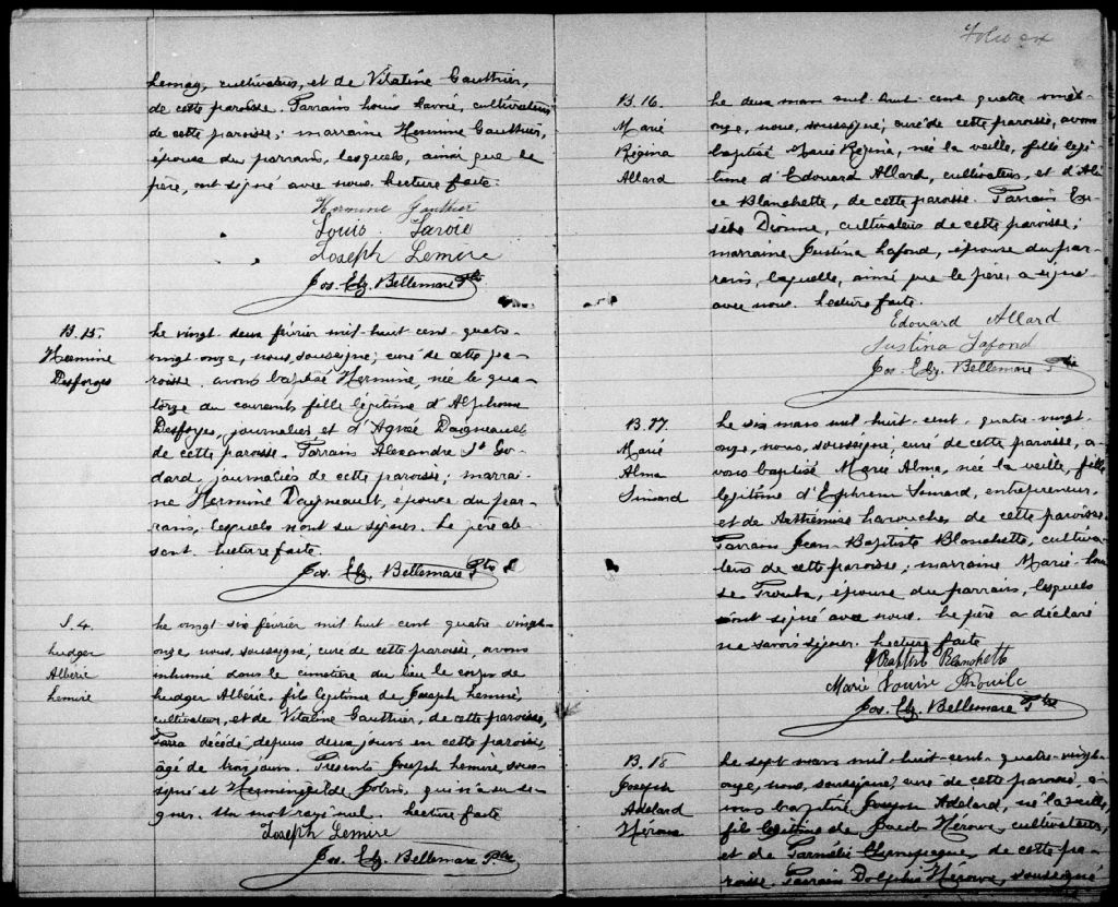 Cette série regroupe les registres originaux de l'état civil, lesquels contiennent les enregistrements de baptêmes, de mariages et de sépultures consignés par le curé ou son représentant au cours de la période concernée par les documents.Outre les renseignements à caractère généalogique que nous pouvons y puiser, cette série peut constituer une source documentaire importante pour toute étude-statistique ou comparative sur les conditions de vie à différentes époques (mortalité infantile, espérance de vie) ou pour toute recherche portant sur l'occupation des terres (lieu de résidence), sur le mode de vie (métiers et professions, statut et âge des époux), sur les classes sociales (titres des parties impliquées, témoins/amis/parents présents lors d'un mariage), sur des évènements spéciaux (quelques mentions dans les sépultures) et sur des sujets à incidence médicale tels les maladies héréditaires (cause du décès)