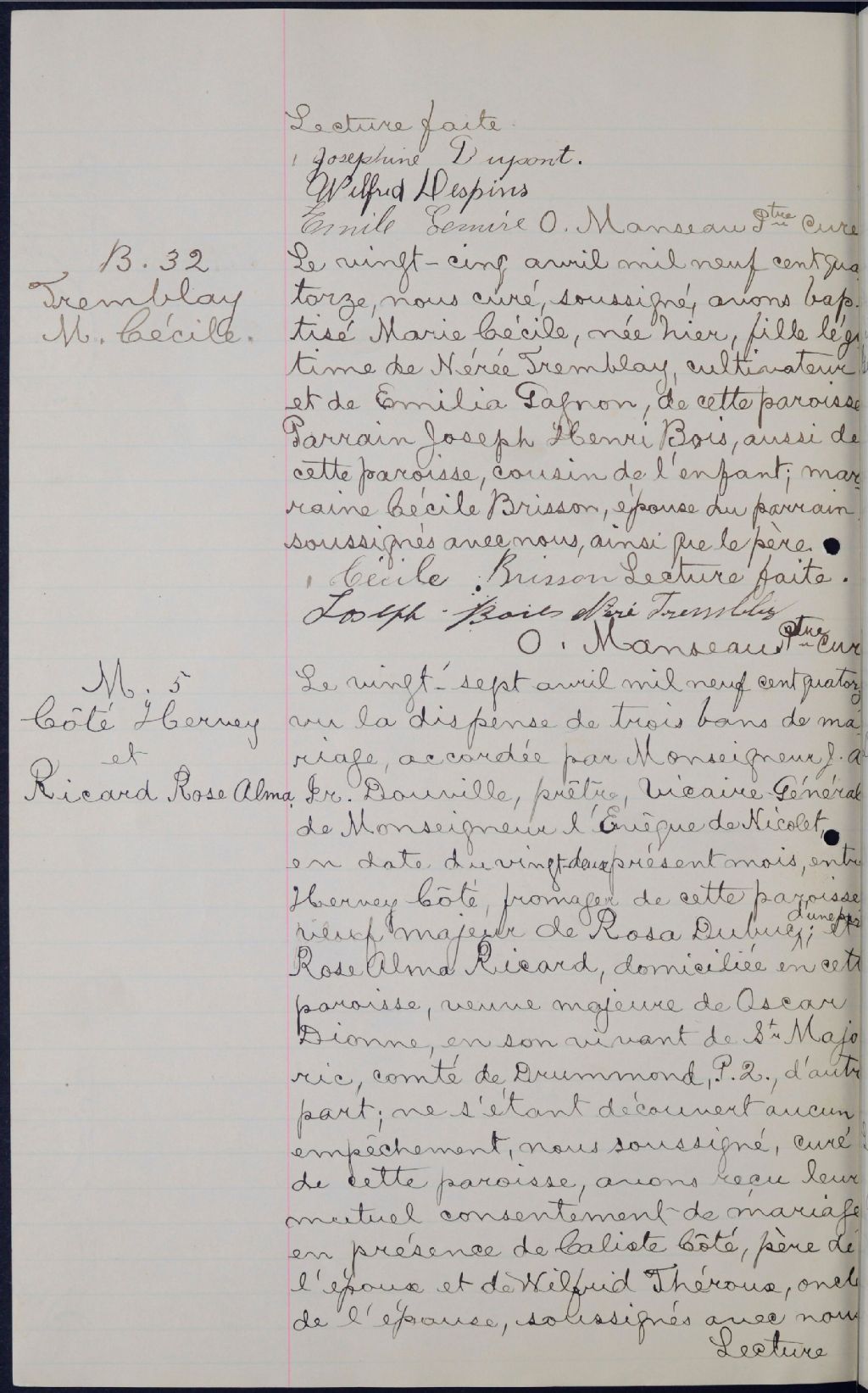 - Cette série regroupe les registres originaux de l'état civil, lesquels contiennent les enregistrements de baptêmes, de mariages et de sépultures consignés par le curé ou son représentant au cours de la période concernée par les documents.Outre les renseignements à caractère généalogique que nous pouvons y puiser, cette série peut constituer une source documentaire importante pour toute étude-statistique ou comparative sur les conditions de vie à différentes époques (mortalité infantile, espérance de vie) ou pour toute recherche portant sur l'occupation des terres (lieu de résidence), sur le mode de vie (métiers et professions, statut et âge des époux), sur les classes sociales (titres des parties impliquées, témoins/amis/parents présents lors d'un mariage), sur des évènements spéciaux (quelques mentions dans les sépultures) et sur des sujets à incidence médicale tels les maladies héréditaires (cause du décès)