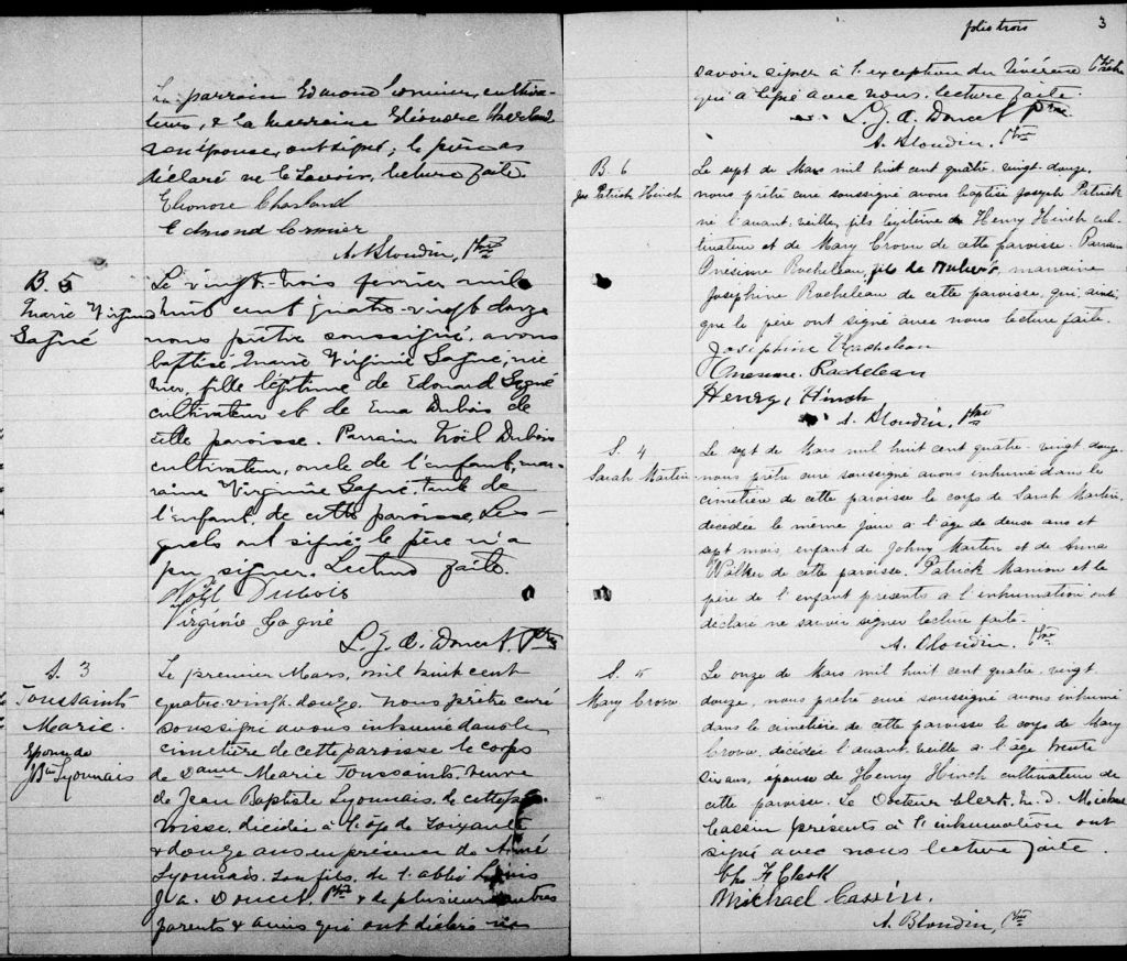- Cette série regroupe les registres originaux de l'état civil, lesquels contiennent les enregistrements de baptêmes, de mariages et de sépultures consignés par le curé ou son représentant au cours de la période concernée par les documents.Outre les renseignements à caractère généalogique que nous pouvons y puiser, cette série peut constituer une source documentaire importante pour toute étude-statistique ou comparative sur les conditions de vie à différentes époques (mortalité infantile, espérance de vie) ou pour toute recherche portant sur l'occupation des terres (lieu de résidence), sur le mode de vie (métiers et professions, statut et âge des époux), sur les classes sociales (titres des parties impliquées, témoins/amis/parents présents lors d'un mariage), sur des évènements spéciaux (quelques mentions dans les sépultures) et sur des sujets à incidence médicale tels les maladies héréditaires (cause du décès)