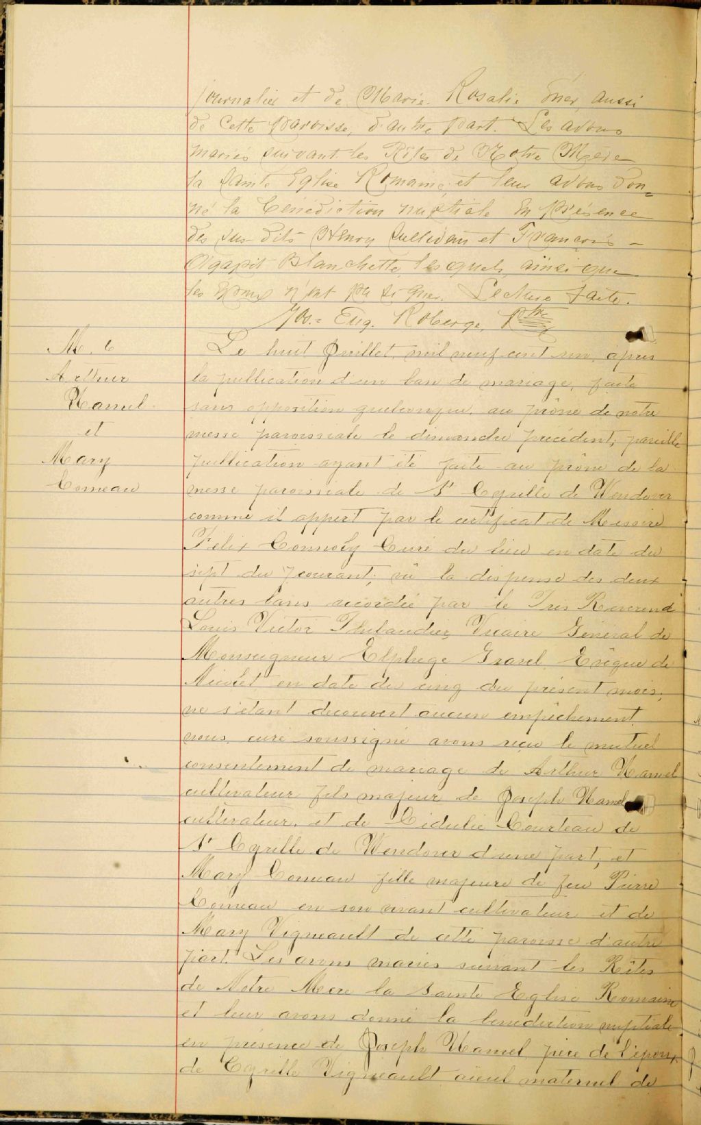 Cette série regroupe les registres originaux de l'état civil, lesquels contiennent les enregistrements de baptêmes, de mariages et de sépultures consignés par le curé ou son représentant au cours de la période concernée par les documents.Outre les renseignements à caractère généalogique que nous pouvons y puiser, cette série peut constituer une source documentaire importante pour toute étude-statistique ou comparative sur les conditions de vie à différentes époques (mortalité infantile, espérance de vie) ou pour toute recherche portant sur l'occupation des terres (lieu de résidence), sur le mode de vie (métiers et professions, statut et âge des époux), sur les classes sociales (titres des parties impliquées, témoins/amis/parents présents lors d'un mariage), sur des évènements spéciaux (quelques mentions dans les sépultures) et sur des sujets à incidence médicale tels les maladies héréditaires (cause du décès)