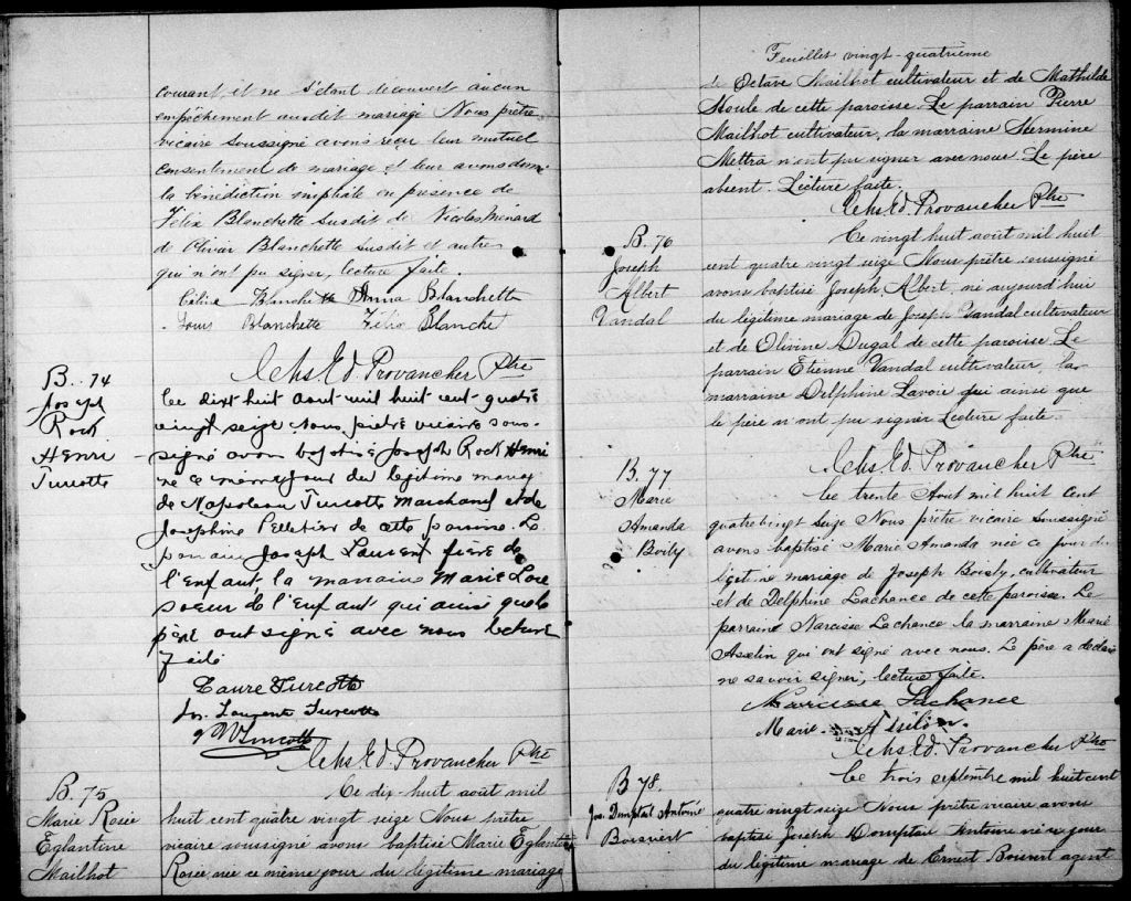 Cette série regroupe les registres originaux de l'état civil, lesquels contiennent les enregistrements de baptêmes, de mariages et de sépultures consignés par le curé ou son représentant au cours de la période concernée par les documents.Outre les renseignements à caractère généalogique que nous pouvons y puiser, cette série peut constituer une source documentaire importante pour toute étude-statistique ou comparative sur les conditions de vie à différentes époques (mortalité infantile, espérance de vie) ou pour toute recherche portant sur l'occupation des terres (lieu de résidence), sur le mode de vie (métiers et professions, statut et âge des époux), sur les classes sociales (titres des parties impliquées, témoins/amis/parents présents lors d'un mariage), sur des évènements spéciaux (quelques mentions dans les sépultures) et sur des sujets à incidence médicale tels les maladies héréditaires (cause du décès)