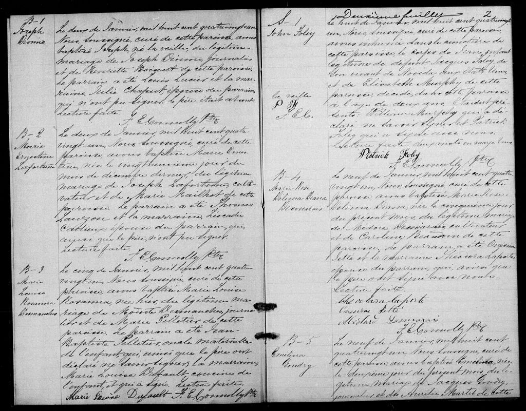 Cette série regroupe les registres originaux de l'état civil, lesquels contiennent les enregistrements de baptêmes, de mariages et de sépultures consignés par le curé ou son représentant au cours de la période concernée par les documents.Outre les renseignements à caractère généalogique que nous pouvons y puiser, cette série peut constituer une source documentaire importante pour toute étude-statistique ou comparative sur les conditions de vie à différentes époques (mortalité infantile, espérance de vie) ou pour toute recherche portant sur l'occupation des terres (lieu de résidence), sur le mode de vie (métiers et professions, statut et âge des époux), sur les classes sociales (titres des parties impliquées, témoins/amis/parents présents lors d'un mariage), sur des évènements spéciaux (quelques mentions dans les sépultures) et sur des sujets à incidence médicale tels les maladies héréditaires (cause du décès)