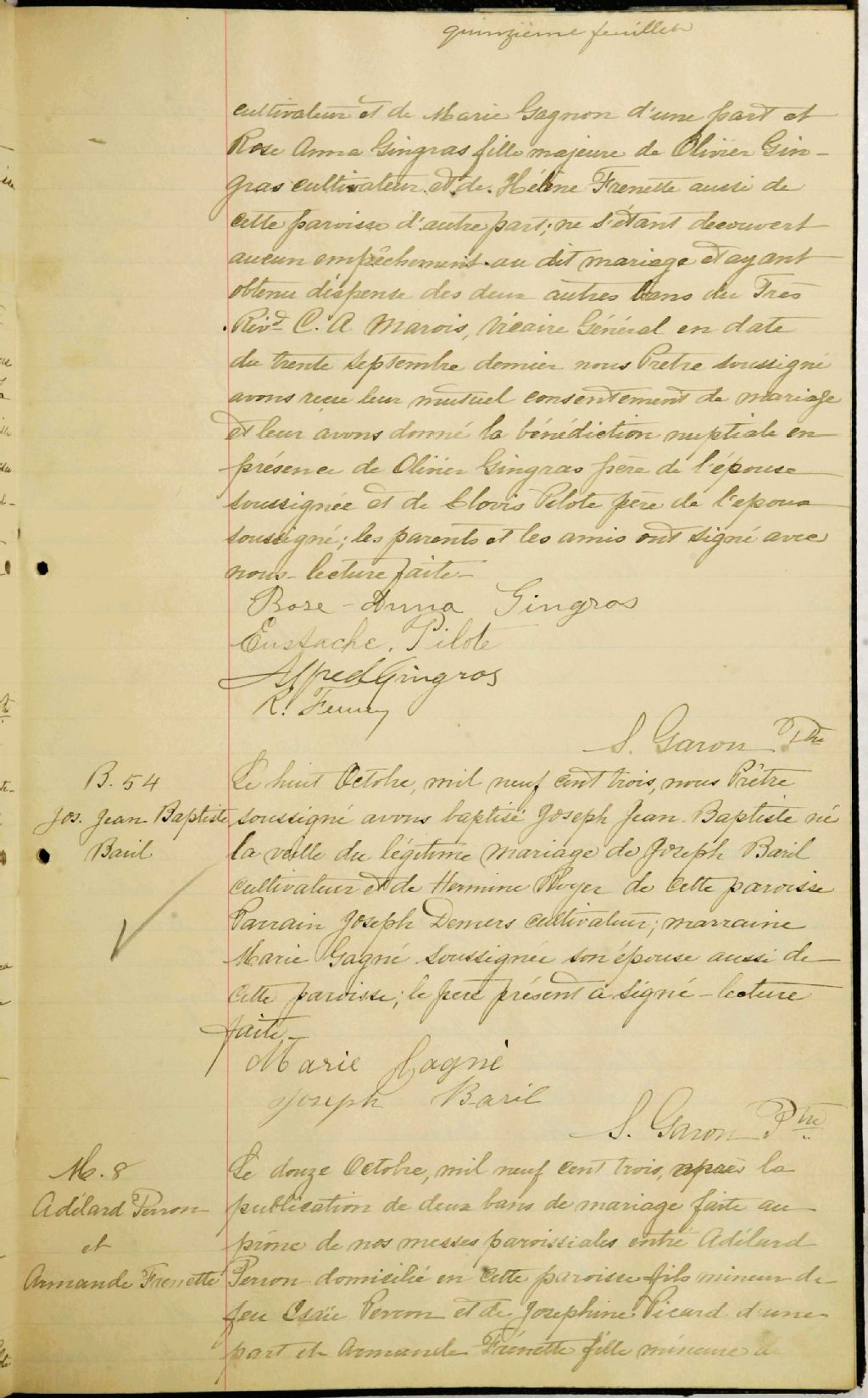 - Cette série regroupe les registres originaux de l'état civil, lesquels contiennent les enregistrements de baptêmes, de mariages et de sépultures consignés par le curé ou son représentant au cours de la période concernée par les documents.Outre les renseignements à caractère généalogique que nous pouvons y puiser, cette série peut constituer une source documentaire importante pour toute étude-statistique ou comparative sur les conditions de vie à différentes époques (mortalité infantile, espérance de vie) ou pour toute recherche portant sur l'occupation des terres (lieu de résidence), sur le mode de vie (métiers et professions, statut et âge des époux), sur les classes sociales (titres des parties impliquées, témoins/amis/parents présents lors d'un mariage), sur des évènements spéciaux (quelques mentions dans les sépultures) et sur des sujets à incidence médicale tels les maladies héréditaires (cause du décès)