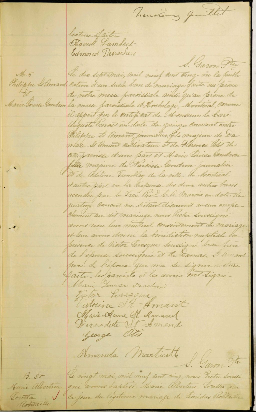 - Cette série regroupe les registres originaux de l'état civil, lesquels contiennent les enregistrements de baptêmes, de mariages et de sépultures consignés par le curé ou son représentant au cours de la période concernée par les documents.Outre les renseignements à caractère généalogique que nous pouvons y puiser, cette série peut constituer une source documentaire importante pour toute étude-statistique ou comparative sur les conditions de vie à différentes époques (mortalité infantile, espérance de vie) ou pour toute recherche portant sur l'occupation des terres (lieu de résidence), sur le mode de vie (métiers et professions, statut et âge des époux), sur les classes sociales (titres des parties impliquées, témoins/amis/parents présents lors d'un mariage), sur des évènements spéciaux (quelques mentions dans les sépultures) et sur des sujets à incidence médicale tels les maladies héréditaires (cause du décès)