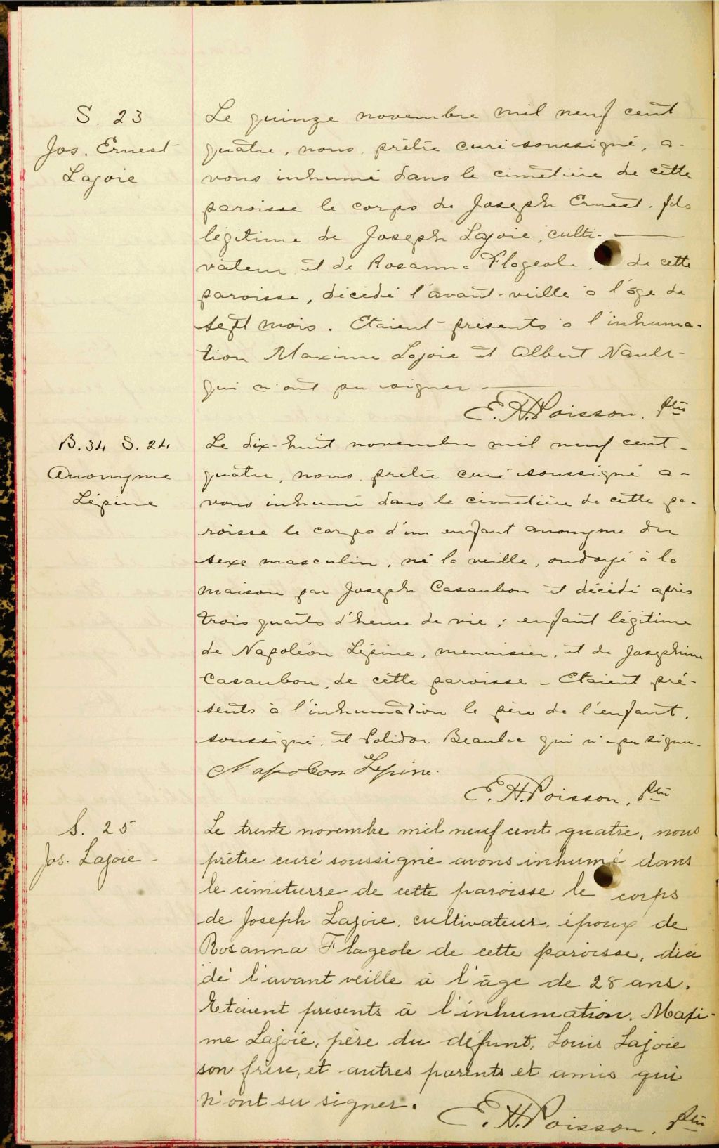 - Cette série regroupe les registres originaux de l'état civil, lesquels contiennent les enregistrements de baptêmes, de mariages et de sépultures consignés par le curé ou son représentant au cours de la période concernée par les documents.Outre les renseignements à caractère généalogique que nous pouvons y puiser, cette série peut constituer une source documentaire importante pour toute étude-statistique ou comparative sur les conditions de vie à différentes époques (mortalité infantile, espérance de vie) ou pour toute recherche portant sur l'occupation des terres (lieu de résidence), sur le mode de vie (métiers et professions, statut et âge des époux), sur les classes sociales (titres des parties impliquées, témoins/amis/parents présents lors d'un mariage), sur des évènements spéciaux (quelques mentions dans les sépultures) et sur des sujets à incidence médicale tels les maladies héréditaires (cause du décès).Les registres couvrant la période 1877 à 1897 et 1899 sont manquants