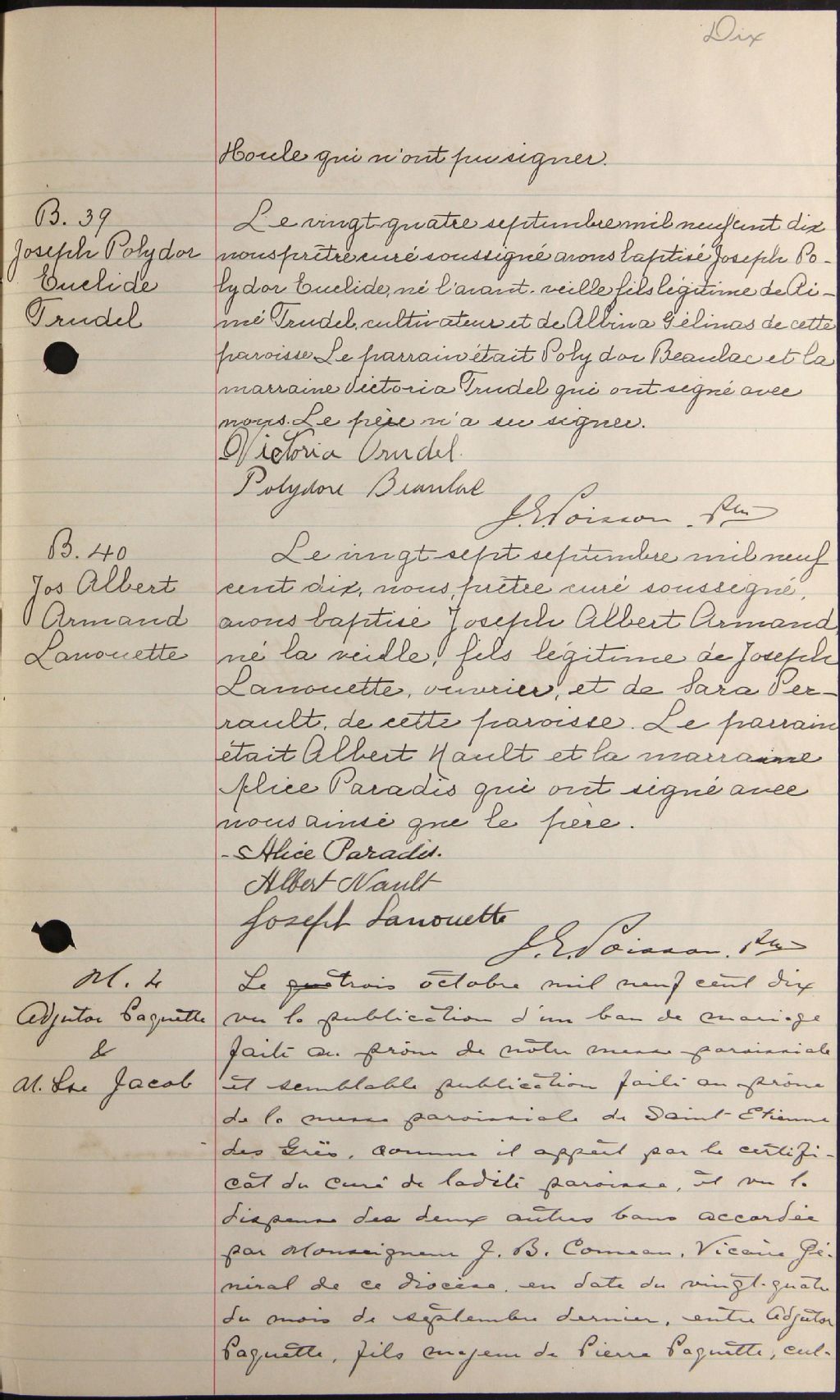 - Cette série regroupe les registres originaux de l'état civil, lesquels contiennent les enregistrements de baptêmes, de mariages et de sépultures consignés par le curé ou son représentant au cours de la période concernée par les documents.Outre les renseignements à caractère généalogique que nous pouvons y puiser, cette série peut constituer une source documentaire importante pour toute étude-statistique ou comparative sur les conditions de vie à différentes époques (mortalité infantile, espérance de vie) ou pour toute recherche portant sur l'occupation des terres (lieu de résidence), sur le mode de vie (métiers et professions, statut et âge des époux), sur les classes sociales (titres des parties impliquées, témoins/amis/parents présents lors d'un mariage), sur des évènements spéciaux (quelques mentions dans les sépultures) et sur des sujets à incidence médicale tels les maladies héréditaires (cause du décès).Les registres couvrant la période 1877 à 1897 et 1899 sont manquants