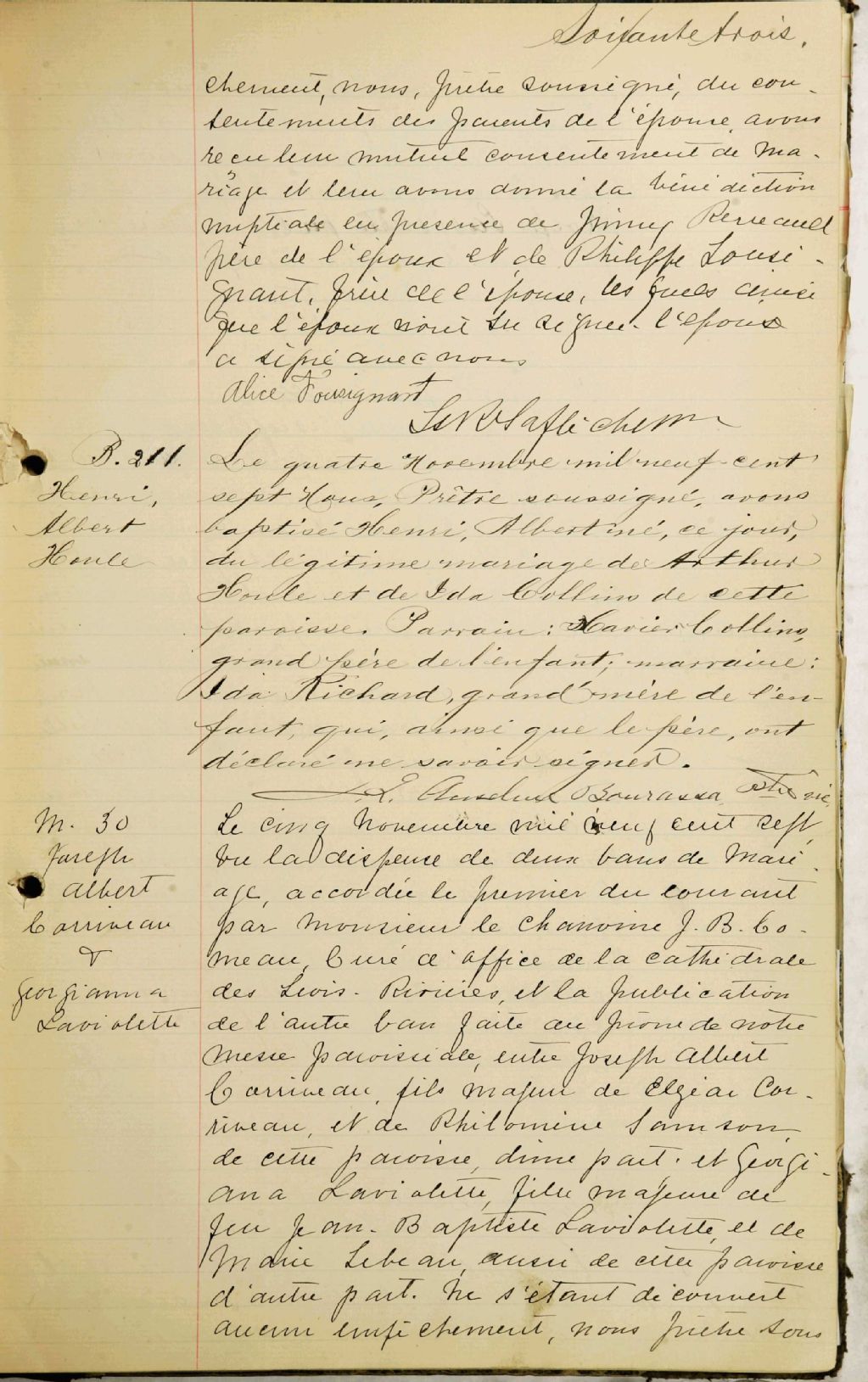 - Cette série regroupe les registres originaux de l'état civil, lesquels contiennent les enregistrements de baptêmes, de mariages et de sépultures consignés par le curé ou son représentant au cours de la période concernée par les documents.Outre les renseignements à caractère généalogique que nous pouvons y puiser, cette série peut constituer une source documentaire importante pour toute étude-statistique ou comparative sur les conditions de vie à différentes époques (mortalité infantile, espérance de vie) ou pour toute recherche portant sur l'occupation des terres (lieu de résidence), sur le mode de vie (métiers et professions, statut et âge des époux), sur les classes sociales (titres des parties impliquées, témoins/amis/parents présents lors d'un mariage), sur des évènements spéciaux (quelques mentions dans les sépultures) et sur des sujets à incidence médicale tels les maladies héréditaires (cause du décès)