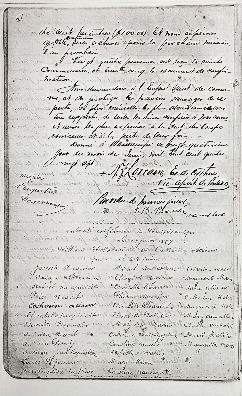 - Registre 1865-1894 (B,M,S,C) : baptêmes (1865-1878; aux pages 1 à 13, 16-19, 21, 23-24, 26-28, 31-33), mariages (1865, 1868-1878; aux pages 1 à 3, 5, 14-15, 20, 25, 29-30), sépultures (1865,1872-1894; aux pages 1, 5, 22), confirmations (1865-1866, à la page 3, 5 ).Pour les endroits suivants : Montaching, Kakipaongaang, Lac Doré, Madawaska, Wemontaching, Mestasini, Rivière-aux-rats, Rivière 8abikonidji, La Tuque, Grande Anse, Mékiskan, Mattawan, Kipasse, Melapeckekak, Mitcikanabick, Barrière, Mékiskaning.Registre 1865 à 1893 (B,M,S,C) : baptêmes (1865-1893), mariages (1865-1869, 1872-1882, 1884-1885,1887-1893), sépultures (1867, 1872-1877, 1886), confirmations (1887).Pour les endroits suivants : Kakipongaang, Grand Lac, Barrière, Cagaswes.Le registre contient aussi le "Certificat d'érection du chemin de la croix dans la chapelle du Grand Lac" et "l'Acte de la visite épiscopale à la Mission Sauvage du Grand Lac Victoria" (1887; à la page [...]