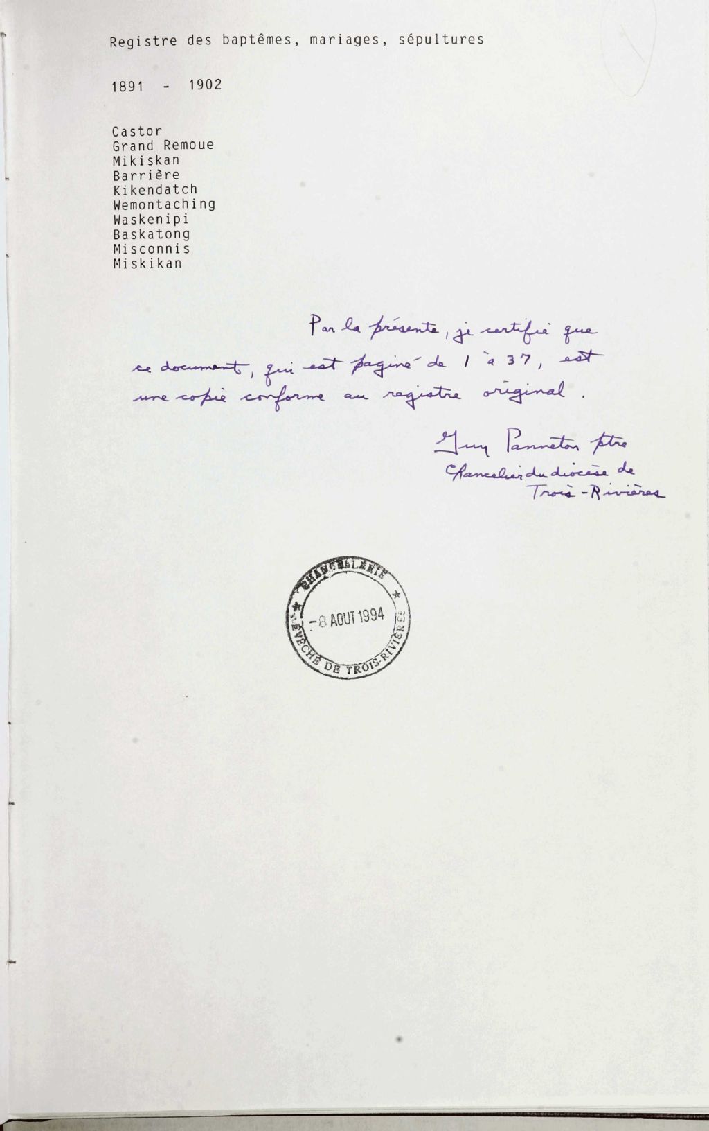 - Registre 1865-1894 (B,M,S,C) : baptêmes (1865-1878; aux pages 1 à 13, 16-19, 21, 23-24, 26-28, 31-33), mariages (1865, 1868-1878; aux pages 1 à 3, 5, 14-15, 20, 25, 29-30), sépultures (1865,1872-1894; aux pages 1, 5, 22), confirmations (1865-1866, à la page 3, 5 ).Pour les endroits suivants : Montaching, Kakipaongaang, Lac Doré, Madawaska, Wemontaching, Mestasini, Rivière-aux-rats, Rivière 8abikonidji, La Tuque, Grande Anse, Mékiskan, Mattawan, Kipasse, Melapeckekak, Mitcikanabick, Barrière, Mékiskaning.Registre 1865 à 1893 (B,M,S,C) : baptêmes (1865-1893), mariages (1865-1869, 1872-1882, 1884-1885,1887-1893), sépultures (1867, 1872-1877, 1886), confirmations (1887).Pour les endroits suivants : Kakipongaang, Grand Lac, Barrière, Cagaswes.Le registre contient aussi le "Certificat d'érection du chemin de la croix dans la chapelle du Grand Lac" et "l'Acte de la visite épiscopale à la Mission Sauvage du Grand Lac Victoria" (1887; à la page 23).Registre 1879-1891 (B,M,C) : baptêmes (1879-1890), mariages (1879-1891), sépultures (aucune), confirmations (1887).Pour les endroits suivants : Grassey Lake, Lac Barrière, Grand Lac, Waswawipi, Wekisdan, Wemontaching, Wammtachingue, Okikendatc, Obicernang, Mattawackweiang, Coucoucresh ou Coucouache, Lac du Moine, Obockteang, Baskitang, Mekiskan, Kipawe, Saint-Maurice, La Croche, Kamikwanagak (G.L.).Le registre contient aussi deux certificats d'érection du chemin de la croix et quelques actes de visites épiscopales et pastorales.Registre 1891-1902 (B,M,S) : baptêmes (1891-1902), mariages (1891-1902), sépultures (1895-1902).Pour les endroits suivants : Castor, Grand Remoue, Mikiskan, Barrière, Kikendatch, Wemontaching, Waskenipi, Baskatong, Misconnis, Miskikan, Okikendak, Wanawan, Wapswanipi, Grand Lac, Mattawack Weia in Grassy Lake, Lac Eravers (Ojiwayan) Lac du Moine, Micomising, Grassy LakeRegistre 1901-1908 (B,M,S) : baptêmes (1901-1908), mariages (1901-1908), sépultures (1903-1908).Pour les endroits suivants: Baskatong, Michonnis, Mattawan, Barrière, Grand Lac, Manawan,Wemontaching, Hikendate, Waswanipi, Obedjwan