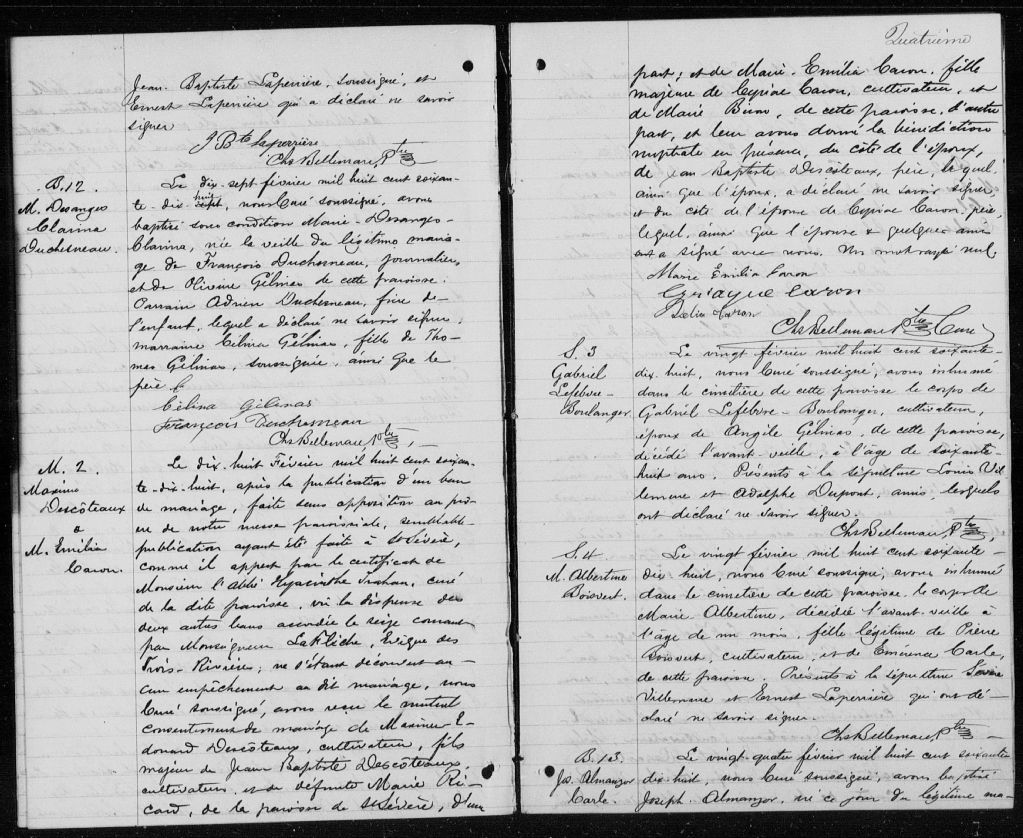 - Cette série regroupe les registres originaux de l'état civil, lesquels contiennent les enregistrements de baptêmes, de mariages et de sépultures consignés par le curé ou son représentant au cours de la période concernée par les documents.Outre les renseignements à caractère généalogique que nous pouvons y puiser, cette série peut constituer une source documentaire importante pour toute étude-statistique ou comparative sur les conditions de vie à différentes époques (mortalité infantile, espérance de vie) ou pour toute recherche portant sur l'occupation des terres (lieu de résidence), sur le mode de vie (métiers et professions, statut et âge des époux), sur les classes sociales (titres des parties impliquées, témoins/amis/parents présents lors d'un mariage), sur des évènements spéciaux (quelques mentions dans les sépultures) et sur des sujets à incidence médicale tels les maladies héréditaires (cause du décès)