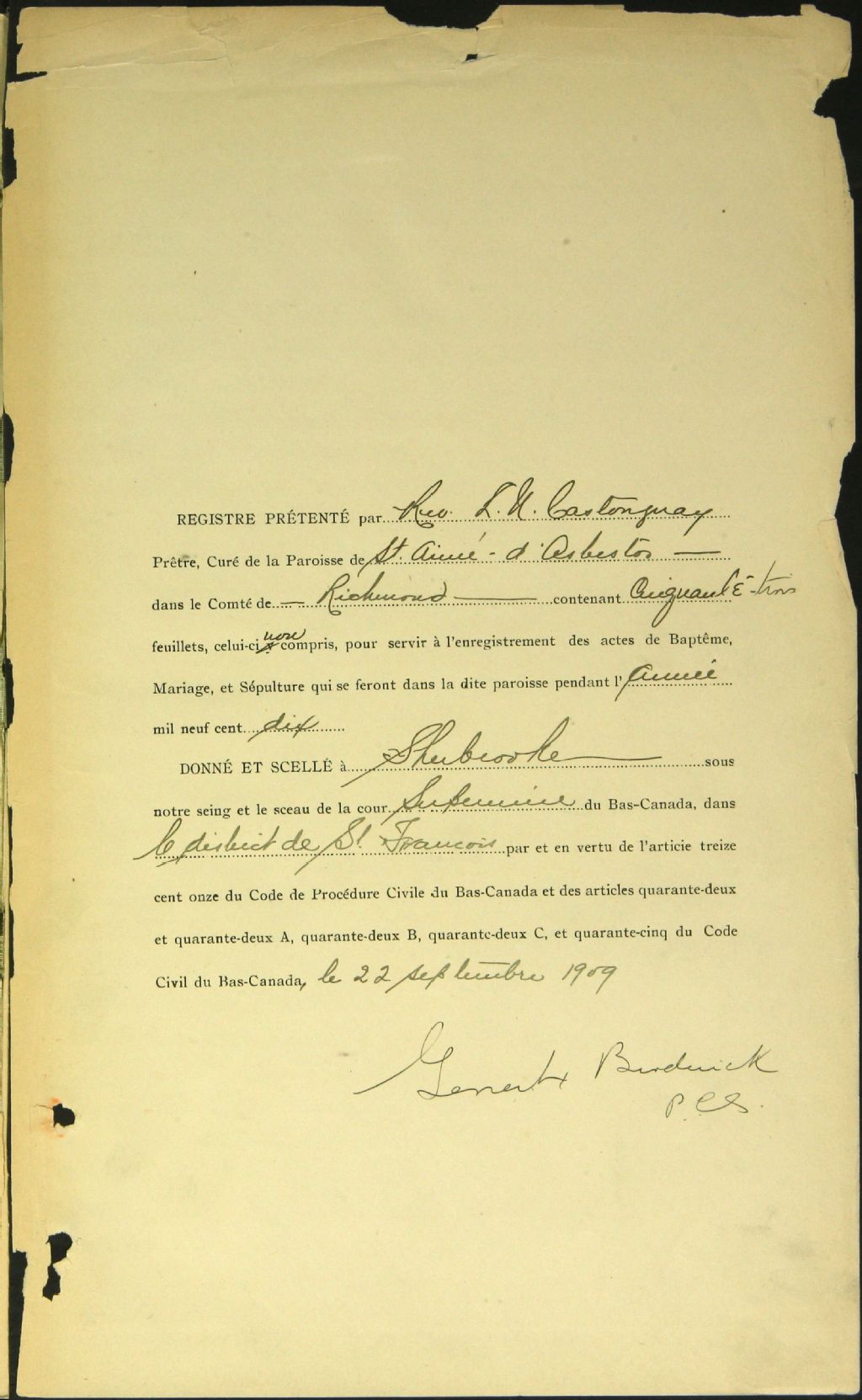 - Cette série regroupe les registres originaux de l'état civil, lesquels contiennent les enregistrements de baptêmes, de mariages et de sépultures consignés par le curé ou son représentant desservant la communauté de confession catholique de la paroisse Saint-Aimé, située à Val-des-Sources. On retrouve également, en règle générale, un index nominatif à la fin de chaque registre