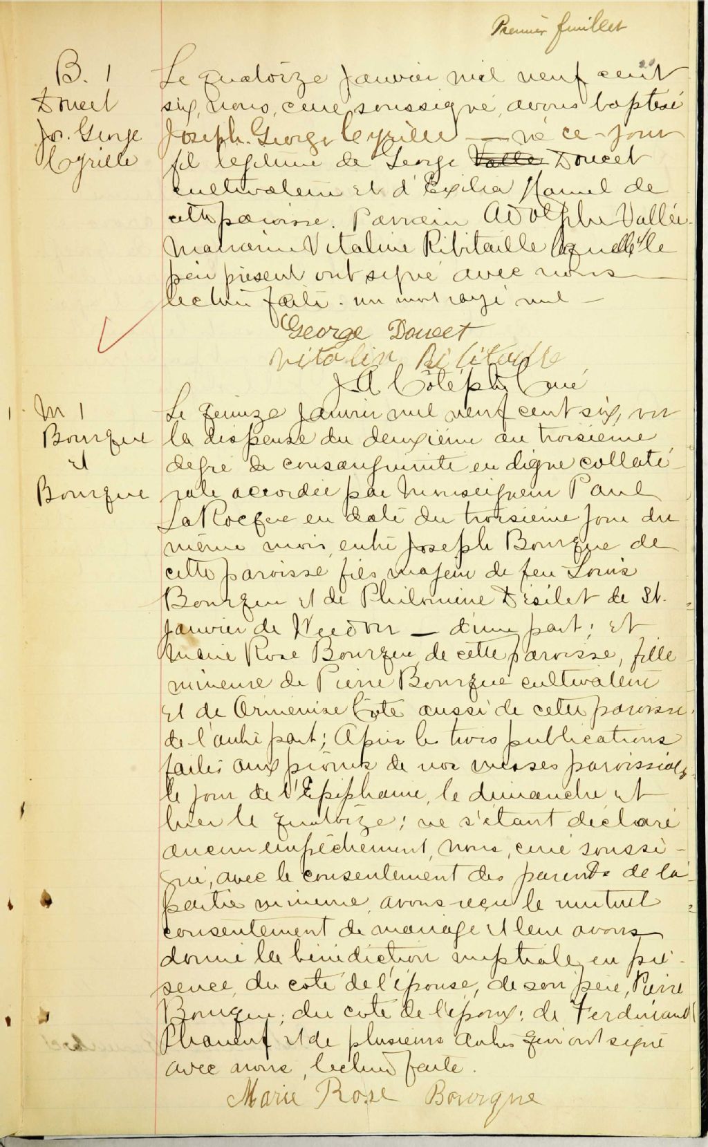 Cette série regroupe les registres originaux de l'état civil, lesquels contiennent les enregistrements de baptêmes, de mariages et de sépultures consignés par le curé ou son représentant desservant la communauté de confession catholique de la paroisse Saint-Joseph. On retrouve également, en règle générale, un index nominatif à la fin de chaque registre.Les registres de 1884 à 1886 comprennent aussi les entrées de Saint-Adrien (CE501,S99).Pour 1877 à 1882, voir Saint-Camille (CE501,S7). Pour 1900 et 1904, voir aussi Saint-Janvier de Weedon (CE501,S16)