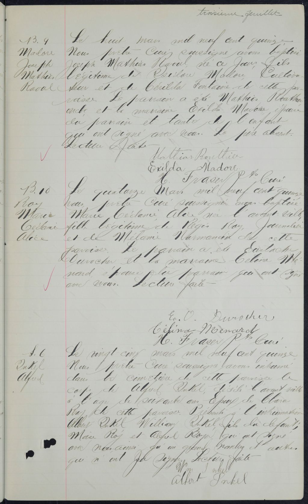 - Cette série regroupe les registres originaux de l'état civil, lesquels contiennent les enregistrements de baptêmes, de mariages et de sépultures consignés par le curé ou son représentant desservant la communauté de confession catholique de la paroisse Saint-Malo. On retrouve également, en règle générale, un index nominatif à la fin de chaque registre.Pour 1864, voir Saint-Thomas-d'Aquin de Compton (CE501,S26). Pour 1865 à 1883, voir Saint-Venant (CE501,S27). Pour 1874 et 1875, pour la paroisse Saint-Magloire, qui fait partie de Saint-Malo, voir Sainte-Edwidge (CE501,S12).Les registres de 1913 et 1914 comprennent des entrées de la paroisse Saint-Isidore (CE501,S183).