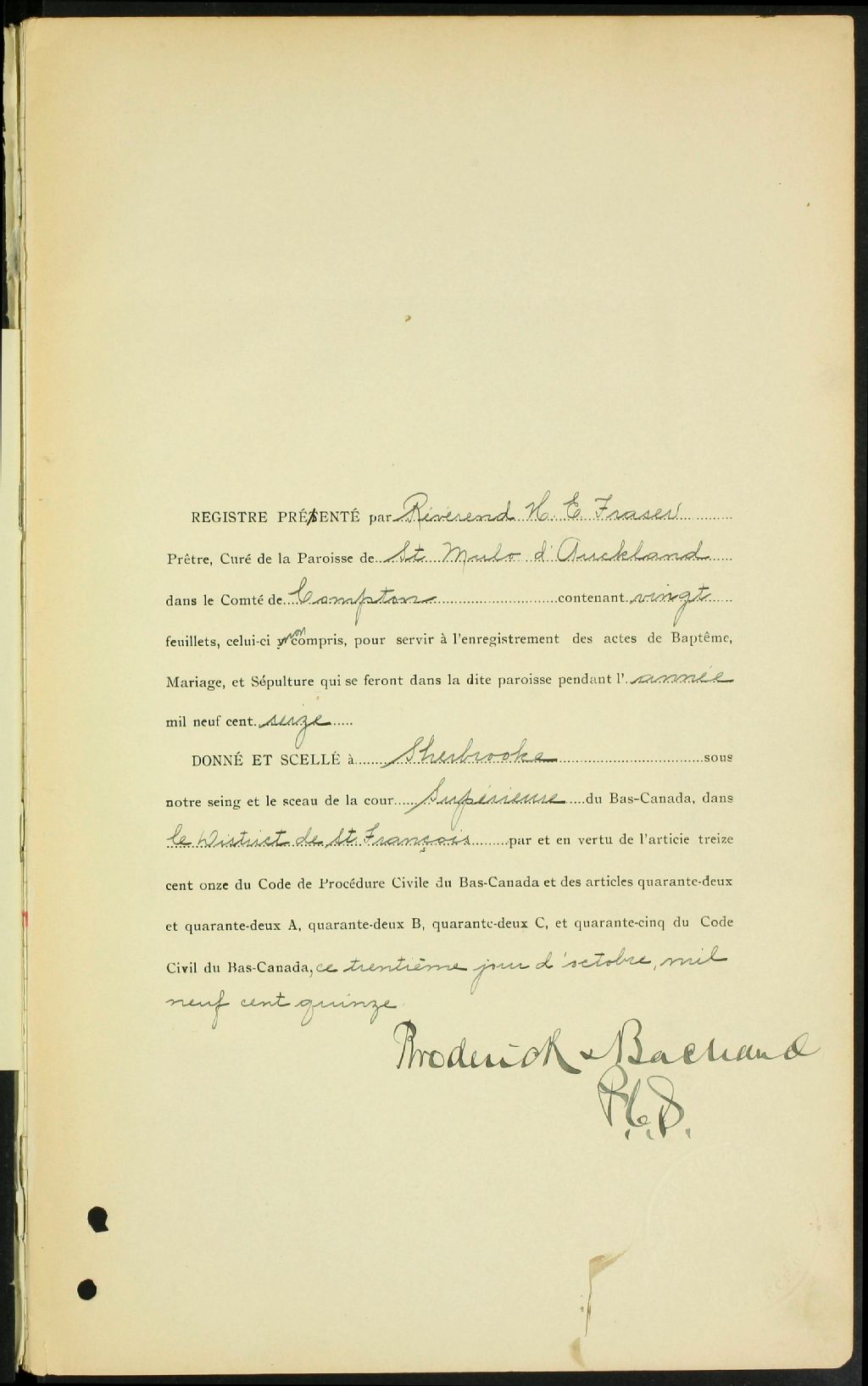 - Cette série regroupe les registres originaux de l'état civil, lesquels contiennent les enregistrements de baptêmes, de mariages et de sépultures consignés par le curé ou son représentant desservant la communauté de confession catholique de la paroisse Saint-Malo. On retrouve également, en règle générale, un index nominatif à la fin de chaque registre.Pour 1864, voir Saint-Thomas-d'Aquin de Compton (CE501,S26). Pour 1865 à 1883, voir Saint-Venant (CE501,S27). Pour 1874 et 1875, pour la paroisse Saint-Magloire, qui fait partie de Saint-Malo, voir Sainte-Edwidge (CE501,S12).Les registres de 1913 et 1914 comprennent des entrées de la paroisse Saint-Isidore (CE501,S183).