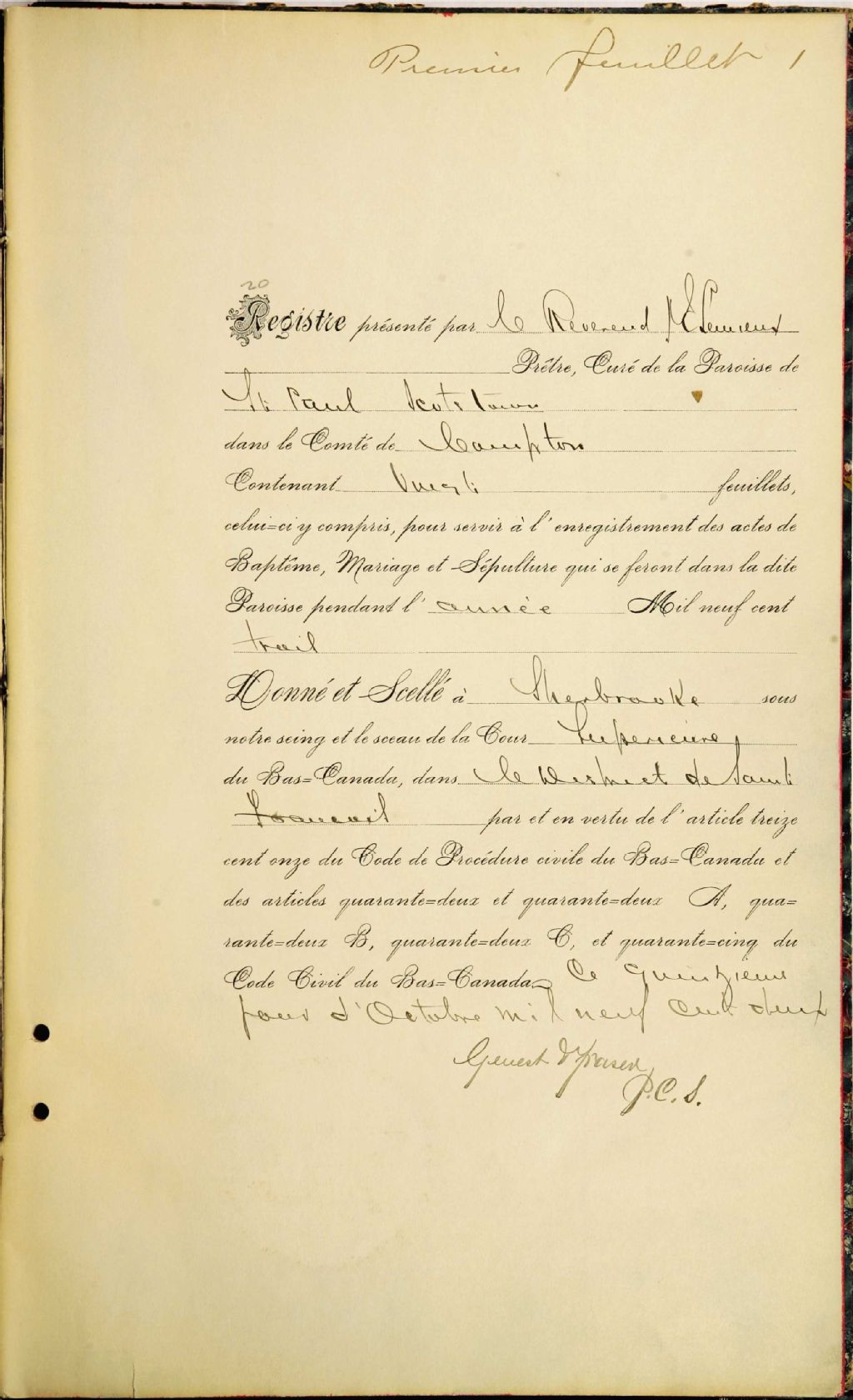 - Cette série regroupe les registres originaux de l'état civil, lesquels contiennent les enregistrements de baptêmes, de mariages et de sépultures consignés par le curé ou son représentant desservant la communauté de confession catholique de la paroisse Saint-Paul de Scotstown. On retrouve également, en règle générale, un index nominatif à la fin de chaque registre.Les registres de 1889 à 1898, ainsi que ceux de 1901 à 1908, contiennent aussi les entrées de Saint-Raphaël de Bury (CE501,S155).Pour 1886 et 1887, voir Saint-Pierre de La Patrie (CE501,S22). Pour 1888, voir Saint-Camille de Cookshire (CE501,S8)