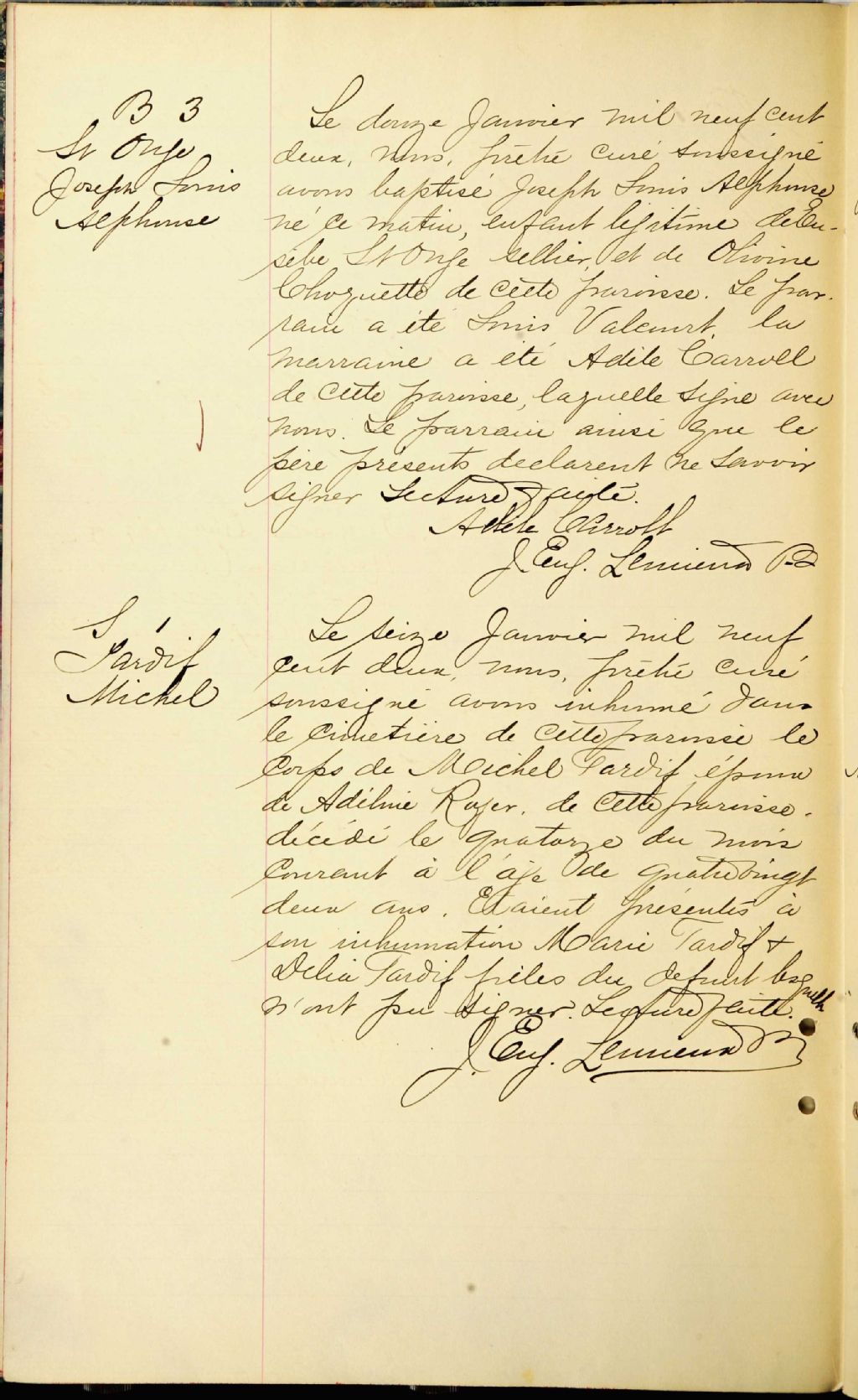 - Cette série regroupe les registres originaux de l'état civil, lesquels contiennent les enregistrements de baptêmes, de mariages et de sépultures consignés par le curé ou son représentant desservant la communauté de confession catholique de la paroisse Saint-Paul de Scotstown. On retrouve également, en règle générale, un index nominatif à la fin de chaque registre.Les registres de 1889 à 1898, ainsi que ceux de 1901 à 1908, contiennent aussi les entrées de Saint-Raphaël de Bury (CE501,S155).Pour 1886 et 1887, voir Saint-Pierre de La Patrie (CE501,S22). Pour 1888, voir Saint-Camille de Cookshire (CE501,S8)