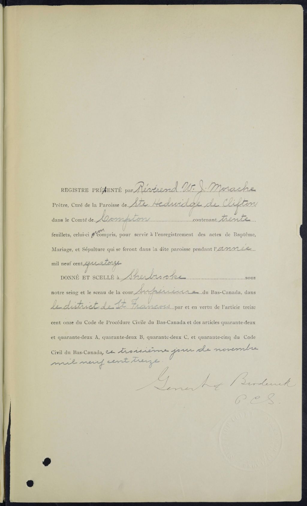 - Cette série regroupe les registres originaux de l'état civil, lesquels contiennent les enregistrements de baptêmes, de mariages et de sépultures consignés par le curé ou son représentant desservant la communauté de confession catholique de la paroisse Sainte-Edwidge, dans le canton de Clifton. On retrouve également, en règle générale, un index nominatif à la fin de chaque registre.Les registres de 1874 et 1875 comprennent aussi les entrées pour la paroisse Saint-Magloire, créée mais non érigée canoniquement dans le hameau Malvina. Ce secteur fait partie de l¿actuelle paroisse Saint-Malo (CE501,S107).Pour 1862 à 1873, voir Saint-Thomas-d'Aquin de Compton (CE501,S26)