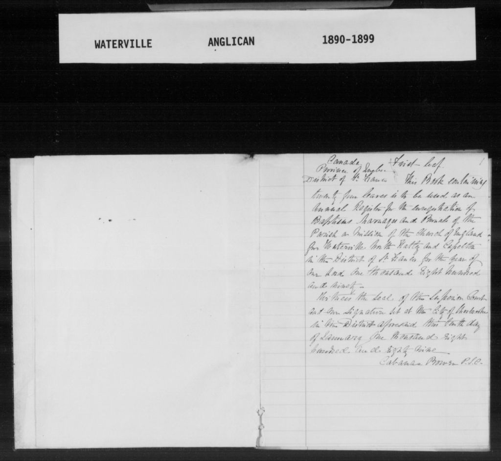 - La série regroupe les registres originaux de l'état civil, lesquels contiennent les enregistrements de baptêmes, de mariages et de sépultures consignés par le ministre desservant la communauté de confession anglicane de Waterville, Eustis et Capelton. On retrouve également, en règle générale, un index nominatif situé à la fin de chaque registre