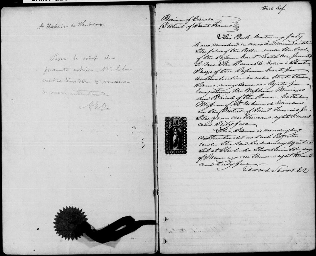 - Cette série regroupe les registres originaux de l'état civil, lesquels contiennent les enregistrements de baptêmes, de mariages et de sépultures consignés par le curé ou son représentant desservant la communauté de confession catholique de la paroisse Saint-Georges située à Saint-Georges-de-Windsor. On retrouve également, en règle générale, un index nominatif à la fin de chaque registre