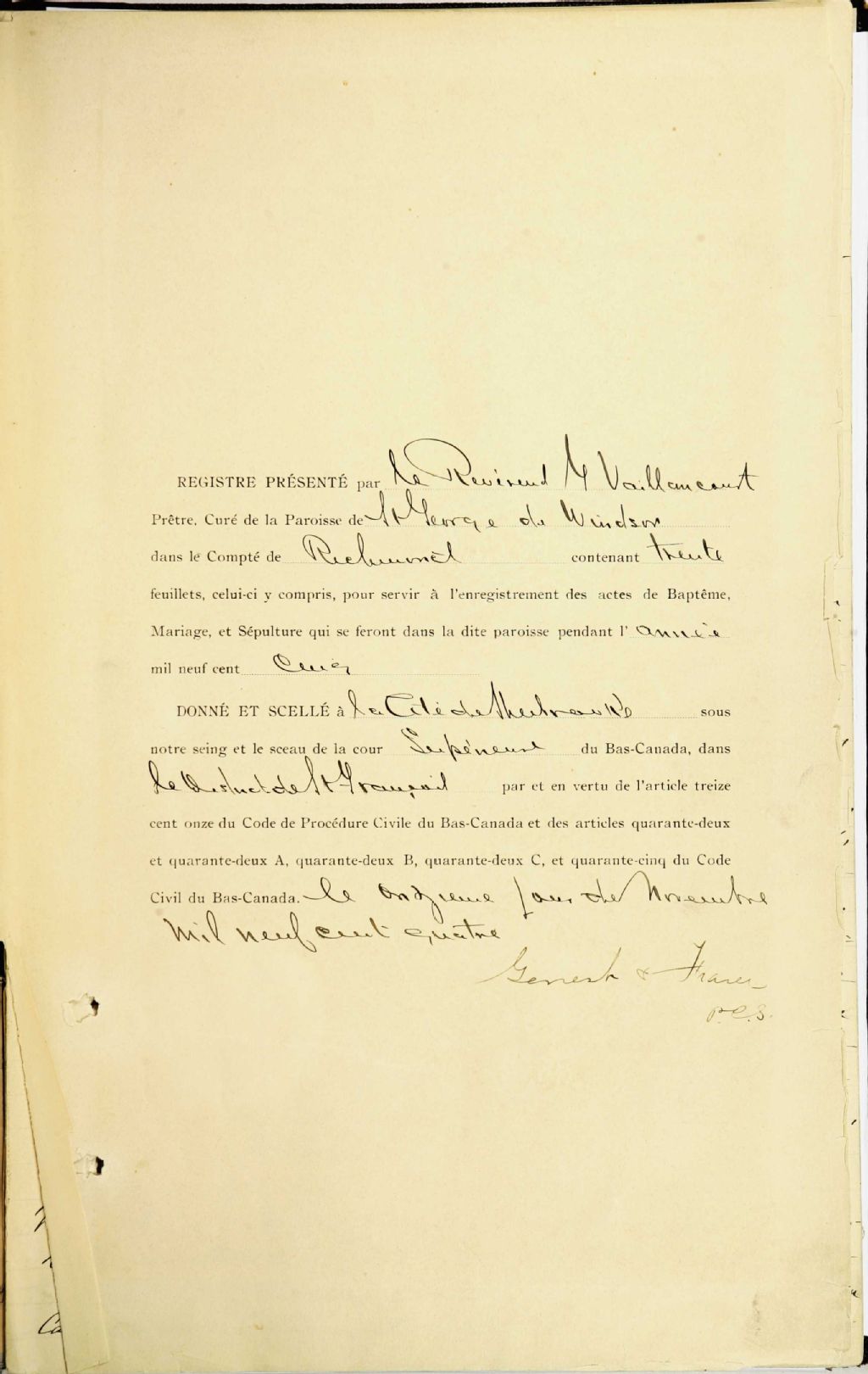 - Cette série regroupe les registres originaux de l'état civil, lesquels contiennent les enregistrements de baptêmes, de mariages et de sépultures consignés par le curé ou son représentant desservant la communauté de confession catholique de la paroisse Saint-Georges située à Saint-Georges-de-Windsor. On retrouve également, en règle générale, un index nominatif à la fin de chaque registre