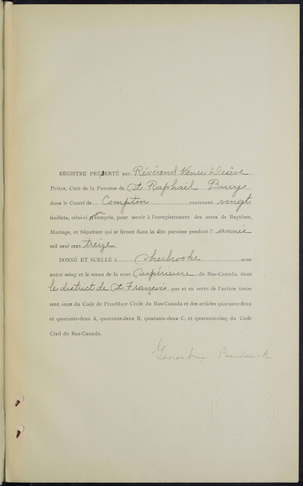 - Cette série regroupe les registres originaux de l'état civil, lesquels contiennent les enregistrements de baptêmes, de mariages et de sépultures consignés par le curé ou son représentant desservant la communauté de confession catholique de la paroisse Saint-Raphaël de Bury. On retrouve également, en règle générale, un index nominatif à la fin de chaque registre.Le registre couvrant la période 1868 à 1876 étant manquant, le chercheur doit consulter le microfilm ZQ7,S2. Pour 1878 à 1888 (sauf 1884), voir Saint-Camille de Cookshire (CE501,S8). Pour 1889 à 1898 et pour 1901 à 1908, voir Saint-Paul de Scotstown (CE501,S109). À ce jour, pour 1877 et 1884, aucune trace d'enregistrement concernant Saint-Raphaël de Bury n'a été retrouvée dans des registres d'autres paroisses