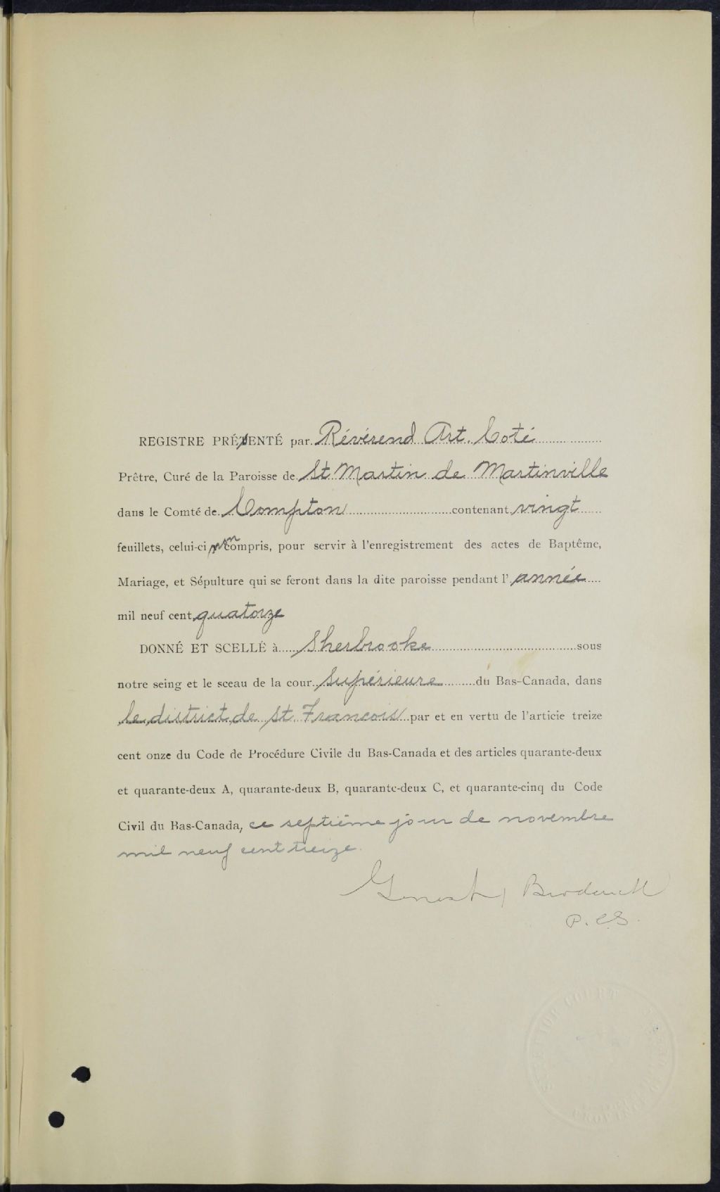 - Cette série regroupe les registres originaux de l'état civil, lesquels contiennent les enregistrements de baptêmes, de mariages et de sépultures consignés par le curé ou son représentant desservant la communauté de confession catholique de la paroisse Saint-Martin de Martinville. On retrouve également, en règle générale, un index nominatif à la fin de chaque registre.Pour 1906, voir Sainte-Edwidge (CE501,S12)