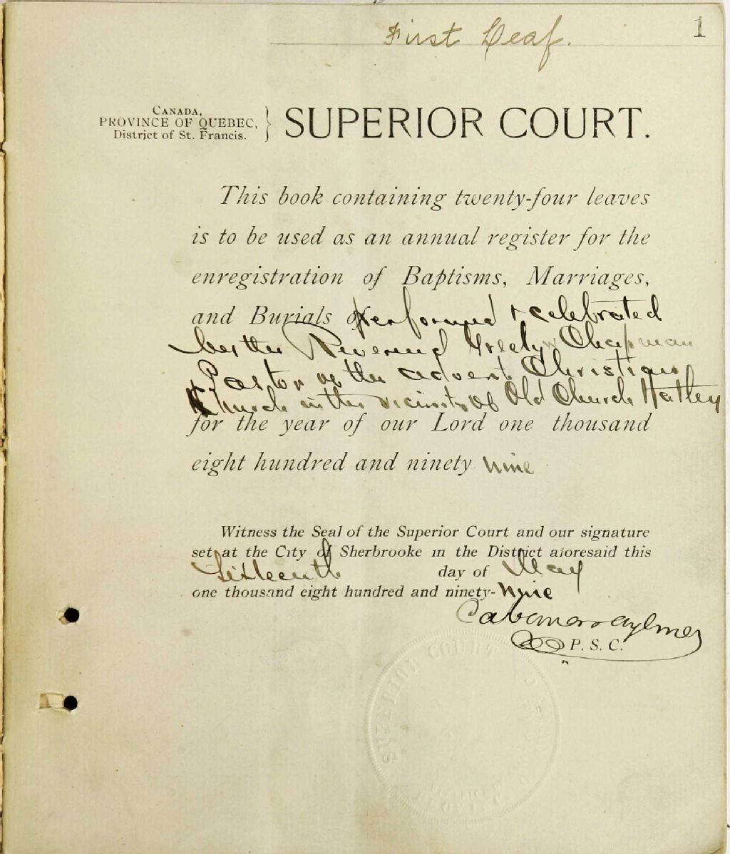 Cette série regroupe les registres originaux de l'état civil, lesquels contiennent les enregistrements de baptêmes ou naissances, de mariages et de sépultures consignés par le pasteur ou son représentant desservant la communauté de confession adventiste chrétienne d'Hatley. On retrouve également, en règle générale, un index nominatif à la fin de chaque registre.Les pasteurs adventistes qui desservaient le canton d¿Hatley, dont les municipalités de Sainte-Catherine-de-Hatley et Ayer's Cliff, ont également desservis des localités situées dans les cantons de Barnston, Stanstead et Compton, tels que Beebe Plain, Coaticook, Stanstead, Magog, Compton, Fitch Bay et Waterville. Chez les adventistes, les pasteurs ratissent largement afin de desservir leur communauté. Plusieurs sont d'ailleurs itinérants et sont régulièrement invités à prêcher dans d'autres communautés adventistes que celle pour laquelle ils sont nominés.Avant 1899, voir la Ayer [...]