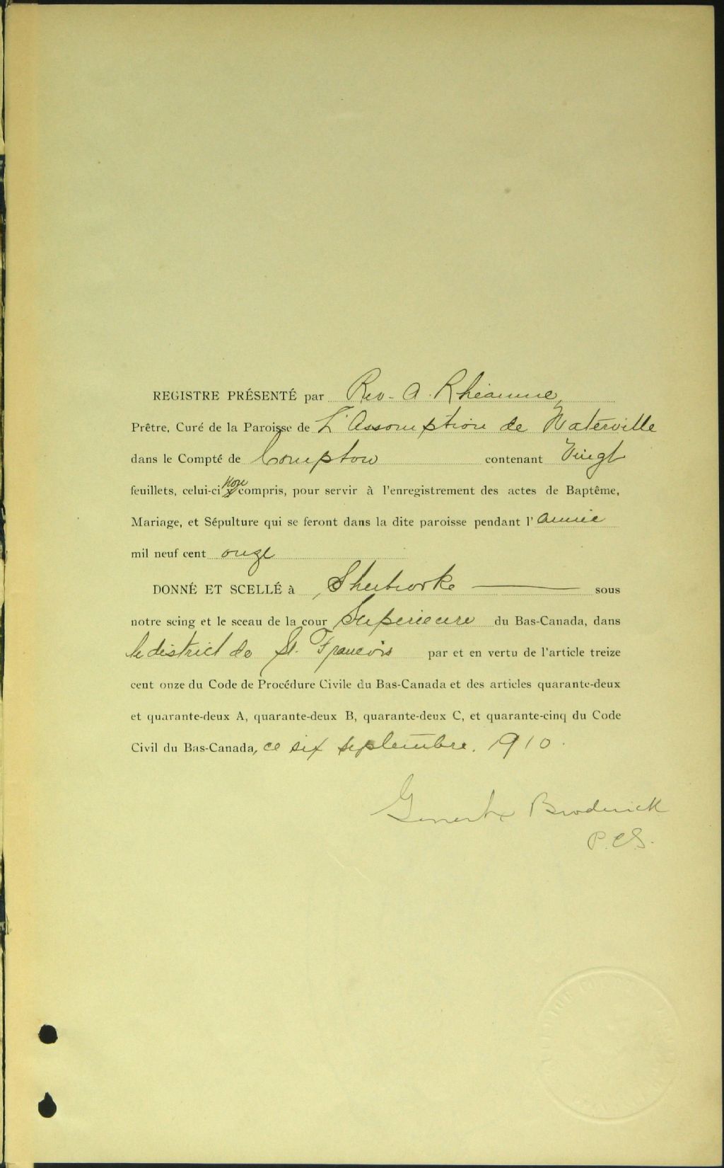 - Cette série regroupe les registres originaux de l'état civil, lesquels contiennent les enregistrements de baptêmes, de mariages et de sépultures consignés par le curé ou son représentant desservant la communauté de confession catholique de la paroisse Assomption-de-la-Bienheureuse-Vierge-Marie de Waterville. On retrouve également, en règle générale, un index nominatif à la fin de chaque registre