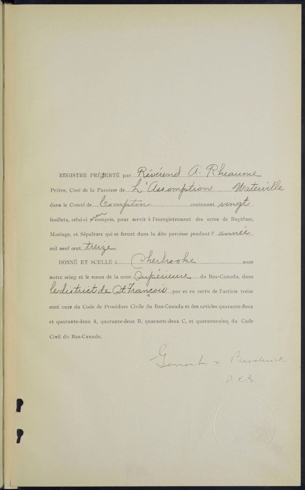 - Cette série regroupe les registres originaux de l'état civil, lesquels contiennent les enregistrements de baptêmes, de mariages et de sépultures consignés par le curé ou son représentant desservant la communauté de confession catholique de la paroisse Assomption-de-la-Bienheureuse-Vierge-Marie de Waterville. On retrouve également, en règle générale, un index nominatif à la fin de chaque registre