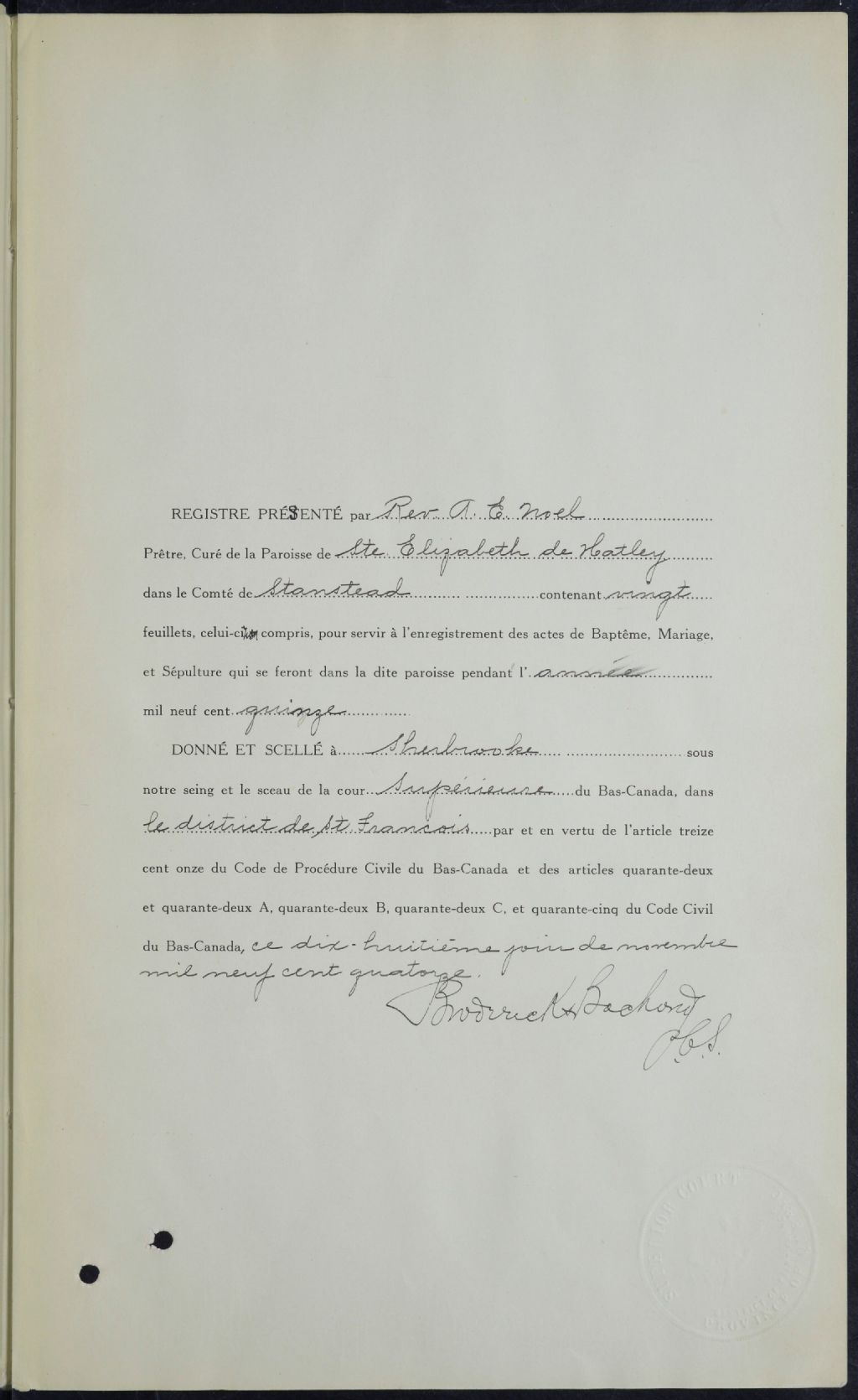Sainte-Élisabeth de North Hatley, 1909-1921, Archives nationales à Sherbrooke, Fonds Cour supérieure. District judiciaire de Saint-François. État civil, (05S,CE501,S178).