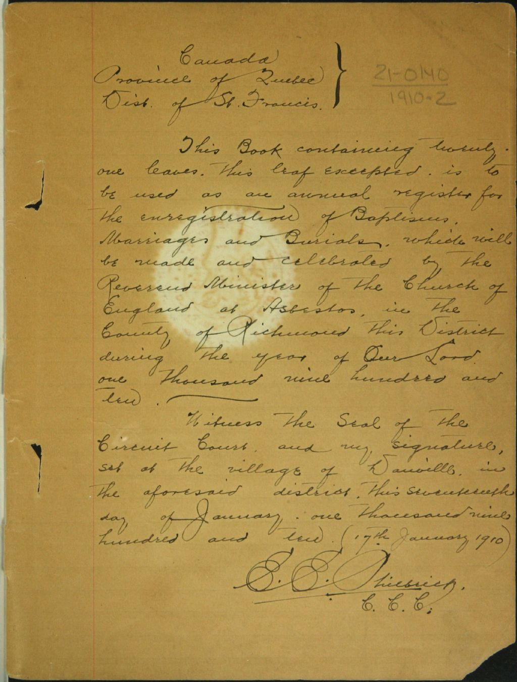 - La série regroupe les registres originaux de l'état civil, lequel contient les enregistrements de baptêmes, de mariages et de sépultures consignés par le ministre desservant la communauté de confession anglicane d'Asbestos. On retrouve également, en règle générale, un index nominatif situé à la fin de chaque registre