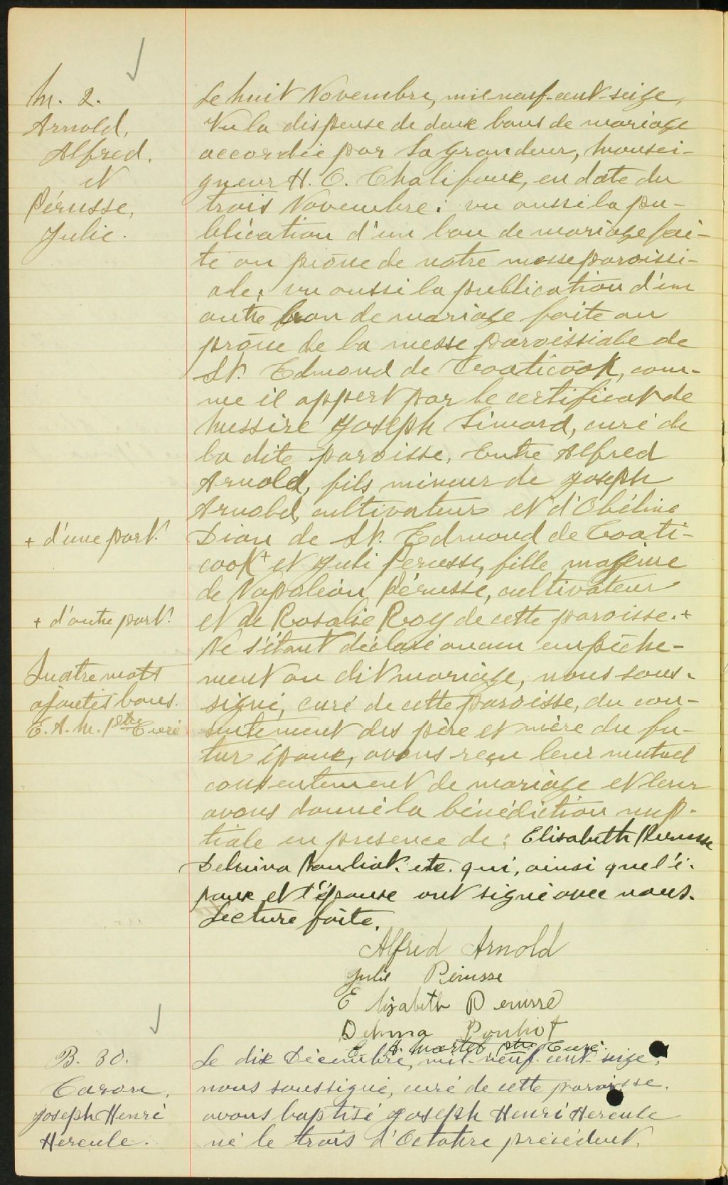 Cette série regroupe les registres originaux de l'état civil, lesquels contiennent les enregistrements de baptêmes, de mariages et de sépultures consignés par le curé ou son représentant desservant la communauté de confession catholique de la paroisse Saint-Isidore. On retrouve également, en règle générale, un index nominatif à la fin de chaque registre