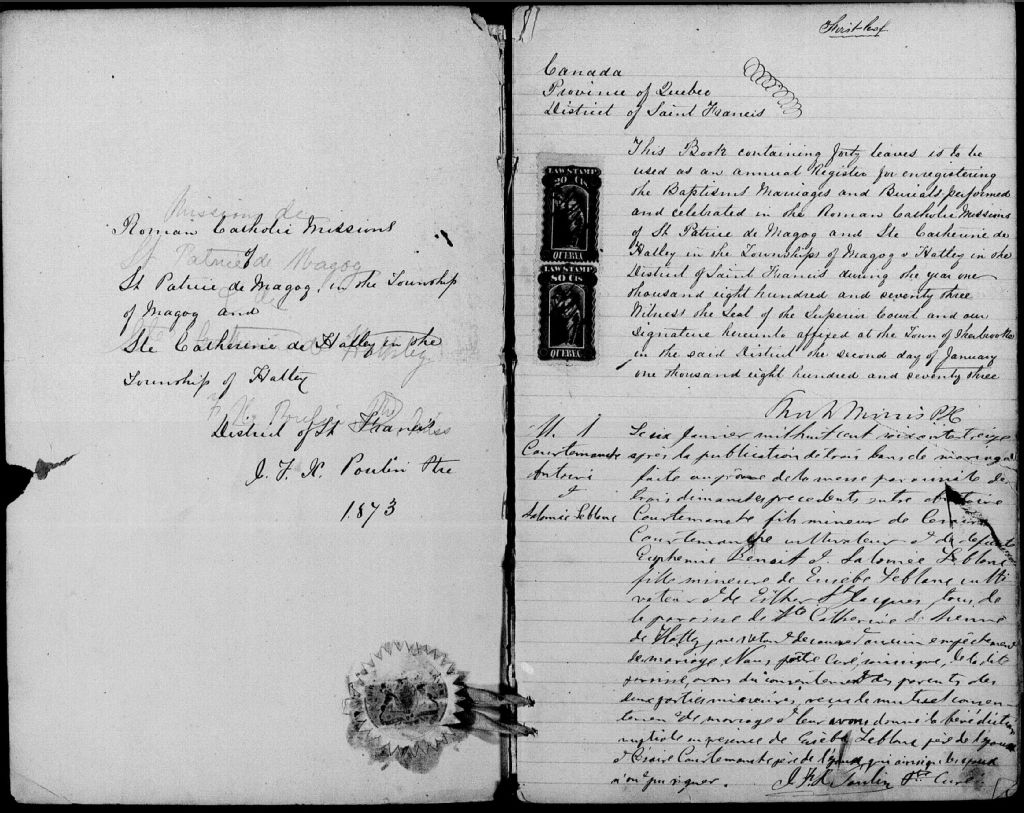 - Cette série regroupe les registres originaux de l'état civil, lesquels contiennent les enregistrements de baptêmes, de mariages et de sépultures consignés par le curé ou son représentant desservant la communauté de confession catholique de la paroisse Saint-Patrice de Magog. On retrouve également, en règle générale, un index nominatif à la fin de chaque registre.Les registres de 1861 à 1881 comprennent aussi les entrées pour la paroisse à Sainte-Catherine-de-Hatley (CE501,S101). Le registre de 1883 comprend aussi les entrées pour la paroisse Saint-Élie d'Orford (CE501,S102).