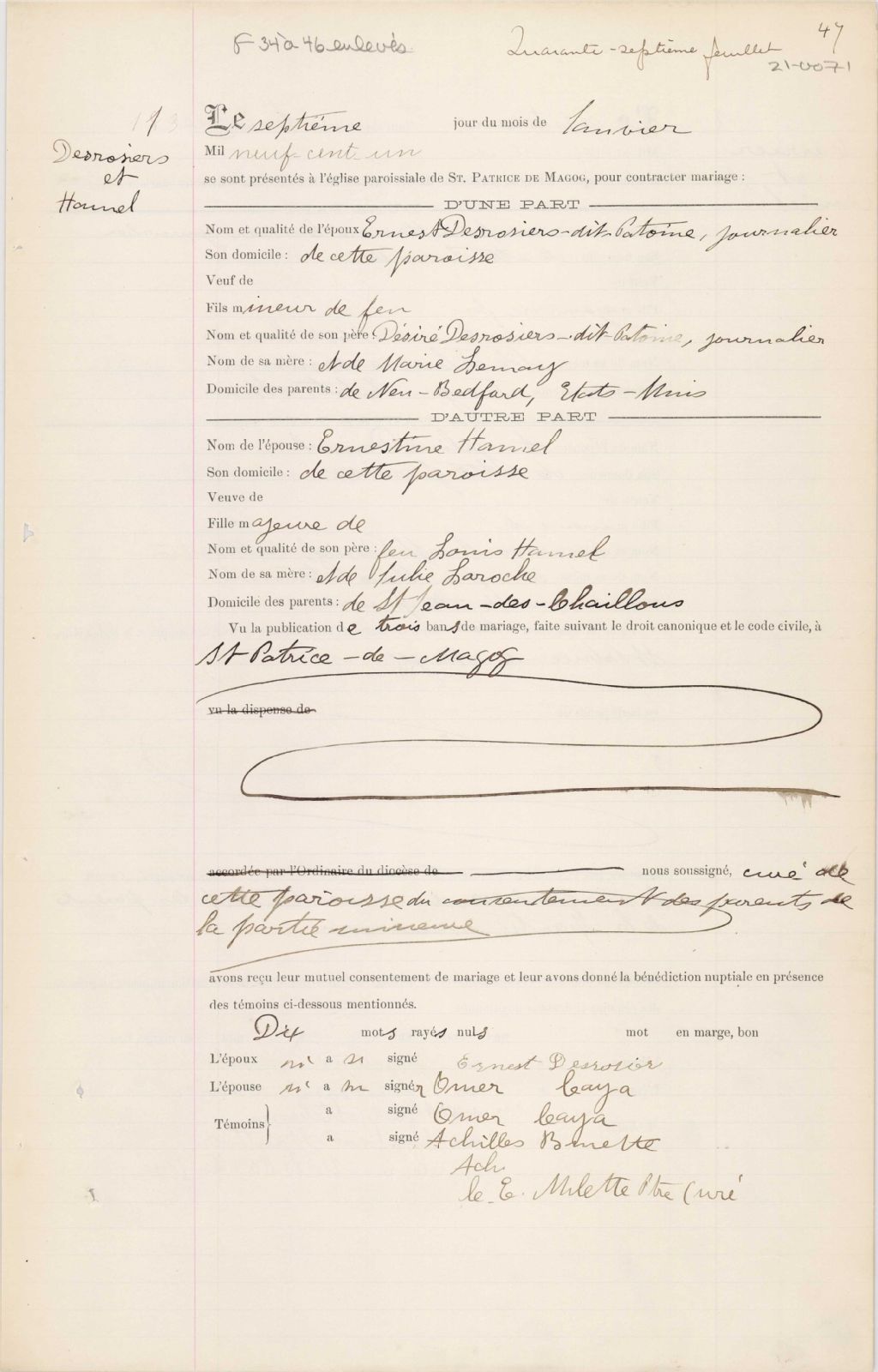 - Cette série regroupe les registres originaux de l'état civil, lesquels contiennent les enregistrements de baptêmes, de mariages et de sépultures consignés par le curé ou son représentant desservant la communauté de confession catholique de la paroisse Saint-Patrice de Magog. On retrouve également, en règle générale, un index nominatif à la fin de chaque registre.Les registres de 1861 à 1881 comprennent aussi les entrées pour la paroisse à Sainte-Catherine-de-Hatley (CE501,S101). Le registre de 1883 comprend aussi les entrées pour la paroisse Saint-Élie d'Orford (CE501,S102).