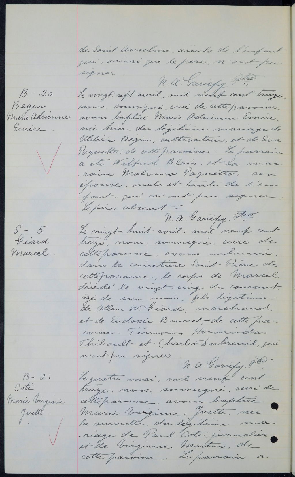 - Cette série regroupe les registres originaux de l'état civil, lesquels contiennent les enregistrements de baptêmes, de mariages et de sépultures consignés par le curé ou son représentant desservant la communauté de confession catholique de la paroisse Saint-Pierre de La Patrie On retrouve également, en règle générale, un index nominatif à la fin de chaque registre.Les registres de 1876 à 1878 comprennent aussi les entrées de Notre-Dame-des-Bois (CE503,S7). Les registres de 1876 à 1882 comprennent aussi les entrées de paroisse La Décollation de Saint-Jean-Baptiste de Chartierville (CE501,S95). Le registre de 1876 comprend aussi les entrées pour la mission Sainte-Famille de Newport (ou d'Island Brook). Les registres de 1886 et 1887 comprennent les entrées pour Saint-Paul de Scotstown (CE501,S109)