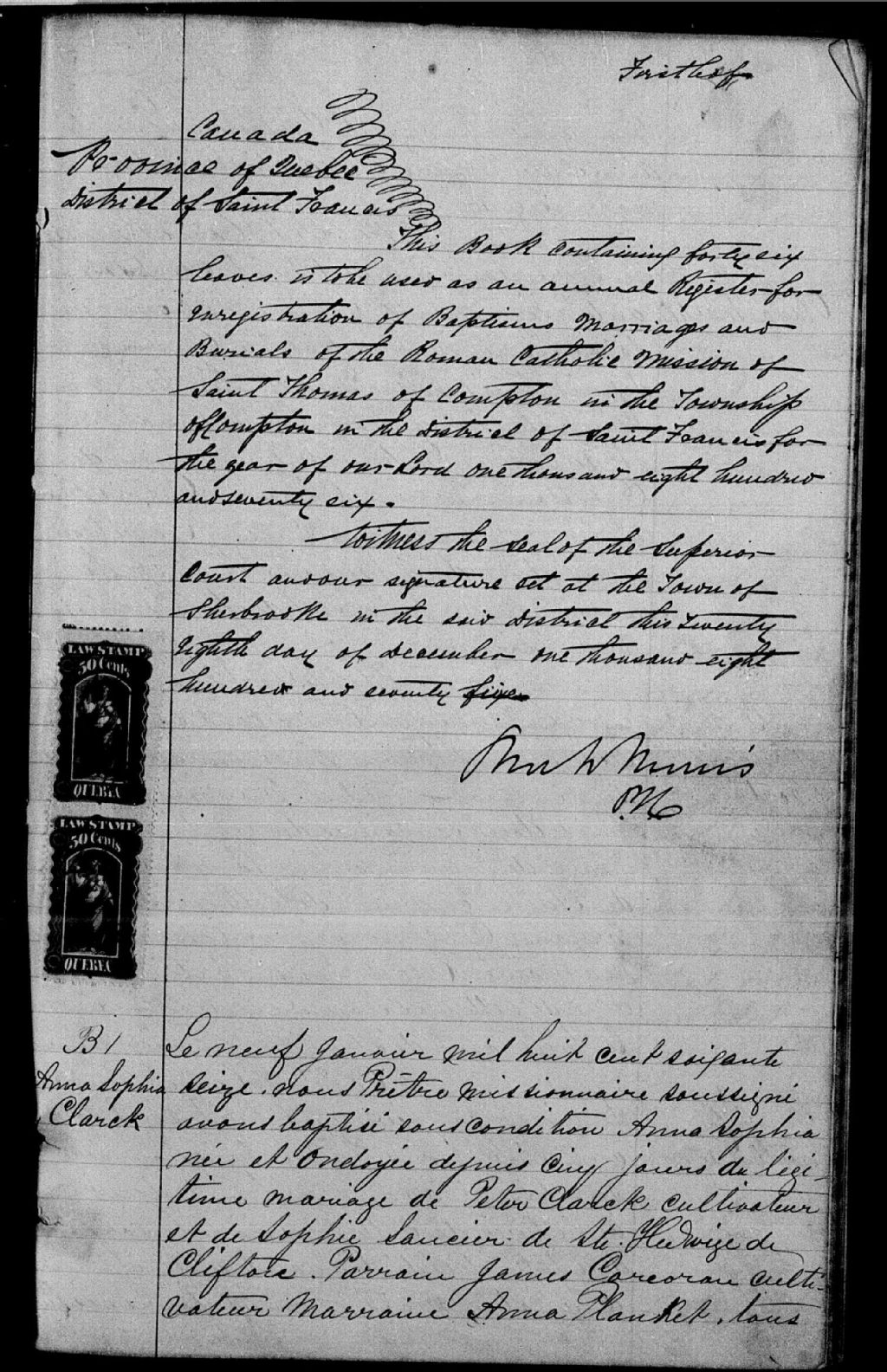 - Cette série regroupe les registres originaux de l'état civil, lesquels contiennent les enregistrements de baptêmes, de mariages et de sépultures consignés par le curé ou son représentant desservant la communauté de confession catholique de la paroisse Saint-Thomas-d¿Aquin de Compton. On retrouve également, en règle générale, un index nominatif à la fin de chaque registre.Les registres de 1862 et 1864 comprennent aussi les entrées pour Saint-Herménégilde (CE501,S14). Les registres de 1862 à 1873 comprennent aussi les entrées de Sainte-Edwidge (CE501,S12). Les registres de 1863 à 1867 comprennent aussi les entrées de Saint-Edmond de Coaticook (CE501,S9). Le registre de 1864 comprend aussi les entrées de Saint-Venant (CE501,S27) et de Saint-Malo (CE501,S107). Les registres de 1864 à 1867 comprennent aussi les entrées de Sainte-Suzanne de Stanhope (CE501,S25). Les registres de 1885 à 1904 comprennent les entrées de Saint-Wilfrid (CE501,S154). Les registres de 1917 et 1918 comprennent aussi des entrées de L'Assomption-de-la-Bienheureuse-Vierge-Marie de Waterville (CE501,S176)