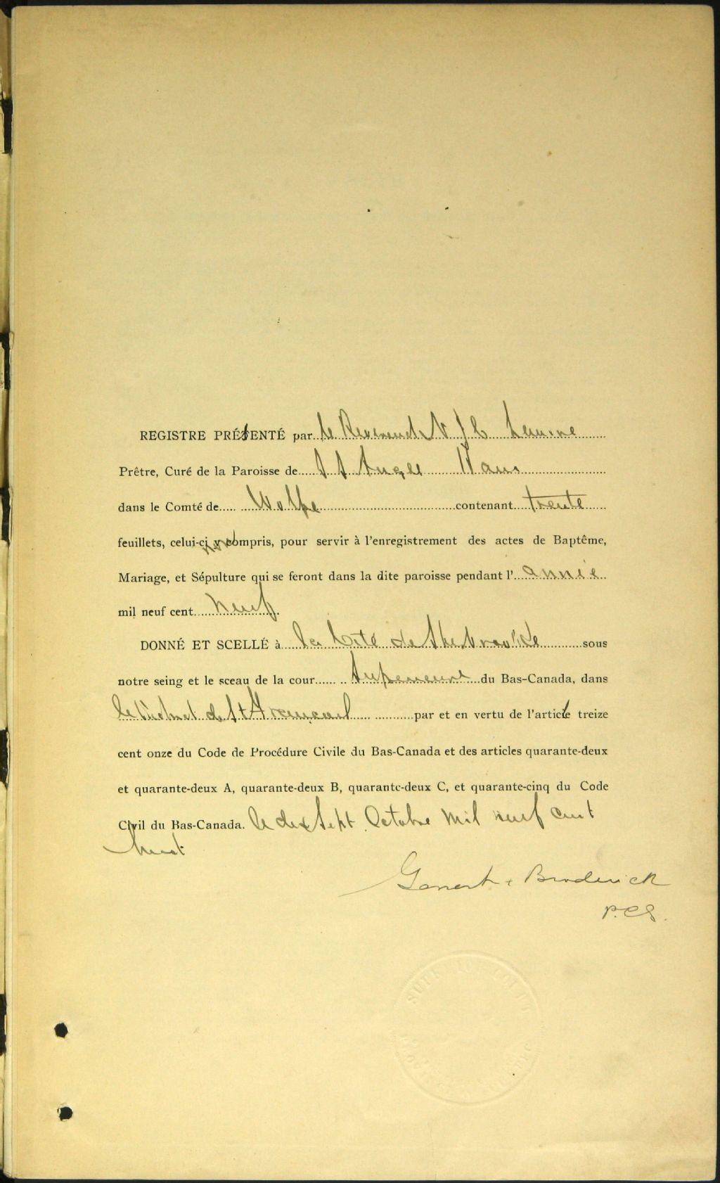 - Cette série regroupe les registres originaux de l'état civil, lesquels contiennent les enregistrements de baptêmes, de mariages et de sépultures consignés par le curé ou son représentant desservant la communauté de confession catholique de la paroisse Saints-Anges de Ham-Nord. On retrouve également, en règle générale, un index nominatif à la fin de chaque registre.Les registres de 1869, 1874 et de 1876 à 1880 comprennent aussi les entrées de Saint-Olivier de Garthby (qui deviendra Saint-Charles-Borromée de Garthby CE305,S35). Les registres de 1877 à 1883 comprennent aussi les entrées de la paroisse Saint-Adrien (CE501,S99).
