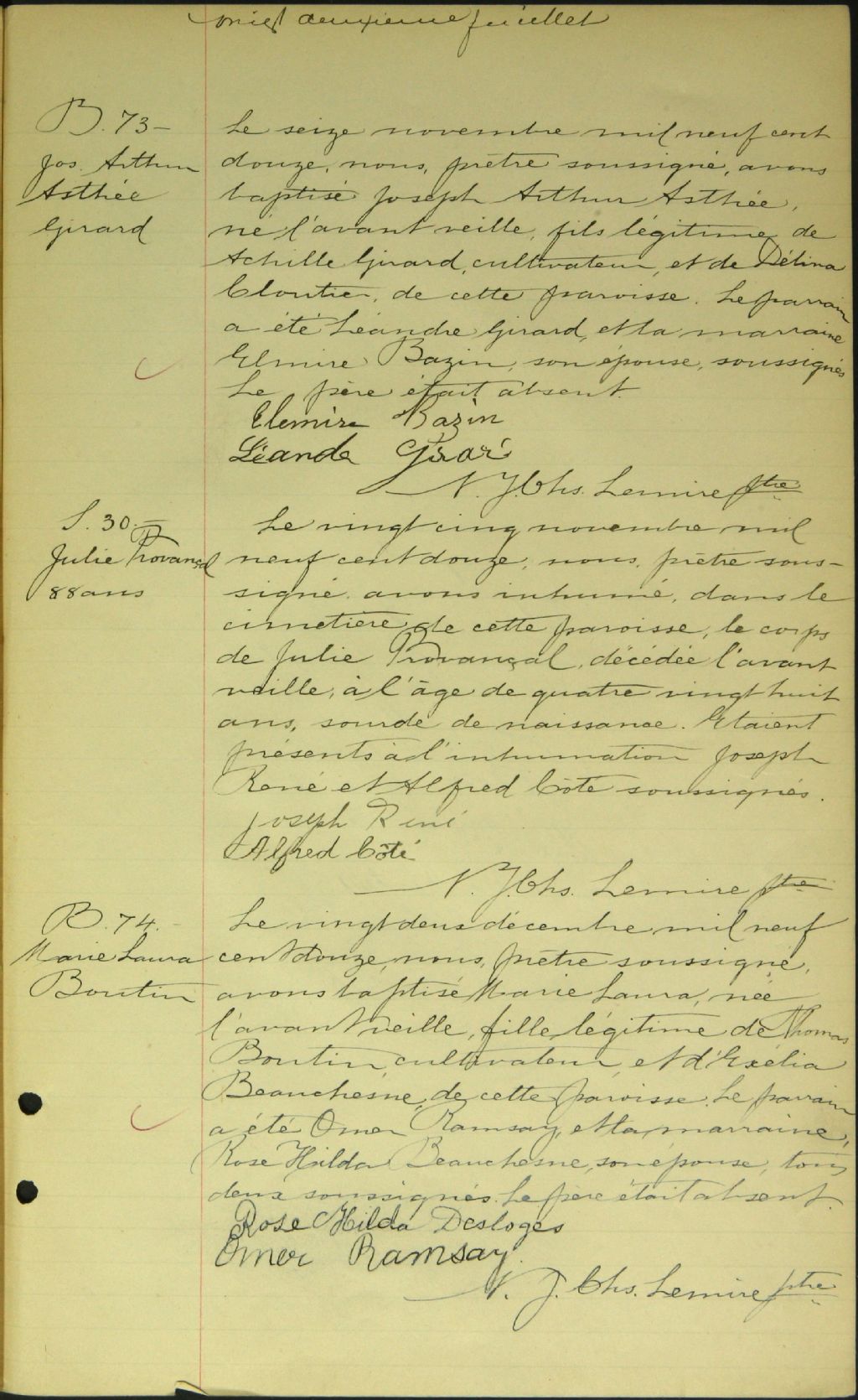 - Cette série regroupe les registres originaux de l'état civil, lesquels contiennent les enregistrements de baptêmes, de mariages et de sépultures consignés par le curé ou son représentant desservant la communauté de confession catholique de la paroisse Saints-Anges de Ham-Nord. On retrouve également, en règle générale, un index nominatif à la fin de chaque registre.Les registres de 1869, 1874 et de 1876 à 1880 comprennent aussi les entrées de Saint-Olivier de Garthby (qui deviendra Saint-Charles-Borromée de Garthby CE305,S35). Les registres de 1877 à 1883 comprennent aussi les entrées de la paroisse Saint-Adrien (CE501,S99).