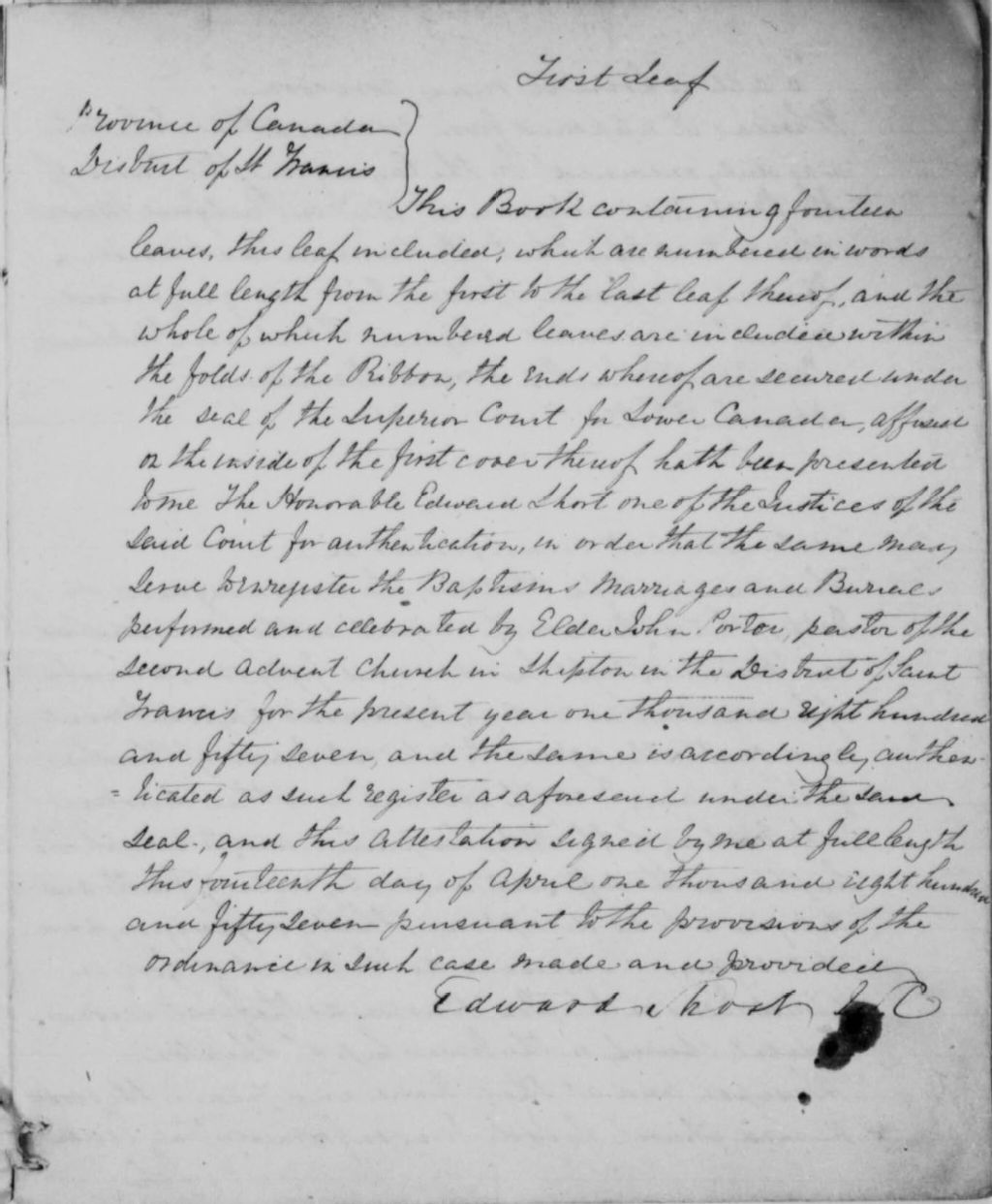 - Cette série regroupe les registres originaux de l'état civil, lesquels contiennent les enregistrements de baptêmes ou naissances, de mariages et de sépultures consignés par le révérend ou son représentant desservant la communauté de confession adventiste chrétienne de Danville. On retrouve également, en règle générale, un index nominatif à la fin de chaque registre.On retrouve des enregistrements de 1870 et 1873 dans le registre de 1881 rédigé par John Ward.Les registres couvrent principalement Danville et le canton de Shipton, mais aussi les cantons de Tingwick, de Wotton, de Melbourne et de Kingsey. On retrouve à quelques reprises des enregistrements de personnes provenant de villes canadiennes et américaines éloignées en raison du rayonnement de la communauté adventiste de Danville. Notamment, des conférences y sont tenues et attirent les croyants.