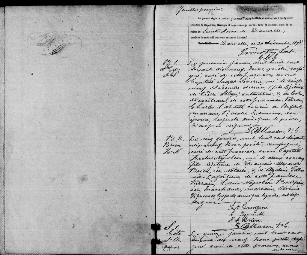 - Cette série regroupe les registres originaux de l'état civil, lesquels contiennent les enregistrements de baptêmes, de mariages et de sépultures consignés par le curé ou son représentant desservant la communauté de confession catholique de la paroisse Sainte-Anne de Danville. On retrouve également, en règle générale, un index nominatif à la fin de chaque registre