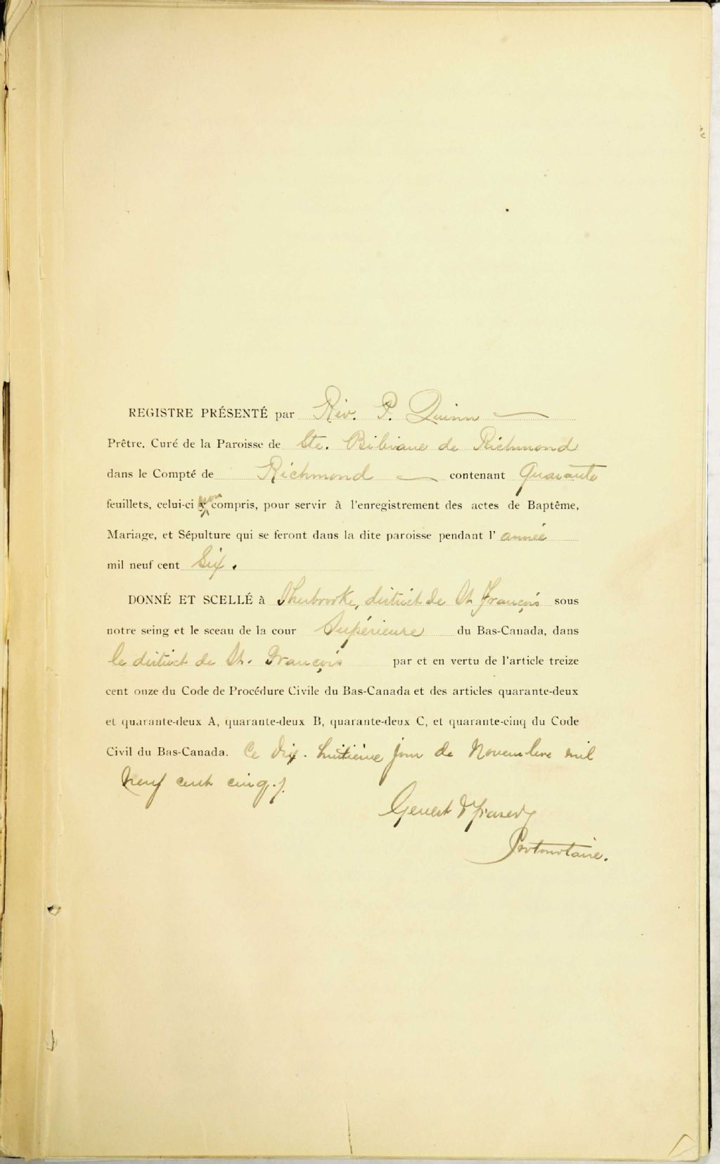 - Cette série regroupe les registres originaux de l'état civil, lesquels contiennent les enregistrements de baptêmes, de mariages et de sépultures consignés par le curé ou son représentant desservant la communauté de confession catholique de la paroisse Sainte-Bibiane de Richmond. On retrouve également, en règle générale, un index nominatif à la fin de chaque registreLes registres de 1872 à 1913 comprennent aussi les actes de la desserte Saint-Malachie de Kingsbury, parfois désignée sous le nom de Rockland Quarry