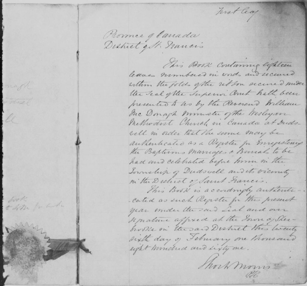 - Cette série regroupe les registres originaux de l'état civil, lesquels contiennent les enregistrements de baptêmes, de mariages et de sépultures consignés par le ministre desservant la communauté de confession méthodiste de Marbleton, dans le canton de Dudswell. On retrouve également, en règle générale, un index nominatif situé à la fin de chaque registre.Les pasteurs méthodistes qui desservaient Marbleton ont également desservis d¿autres localités avoisinantes situées dans le canton de Dudswell, mais également des localités situées dans les cantons de Weedon, de Bury et de Ham.Avant 1861, voir Eaton Methodist Circuit (CE501,S77). À partir de 1869, voir aussi Bury Methodist Church (CE501,S172) puisque des entrées pour le canton de Dudswell s¿y font régulièrement