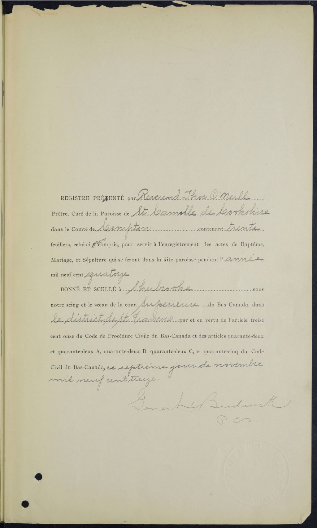 Saint-Camille de Cookshire, 1878-1921, Archives nationales à Sherbrooke, Fonds Cour supérieure. District judiciaire de Saint-François. État civil, (05S,CE501,S8).