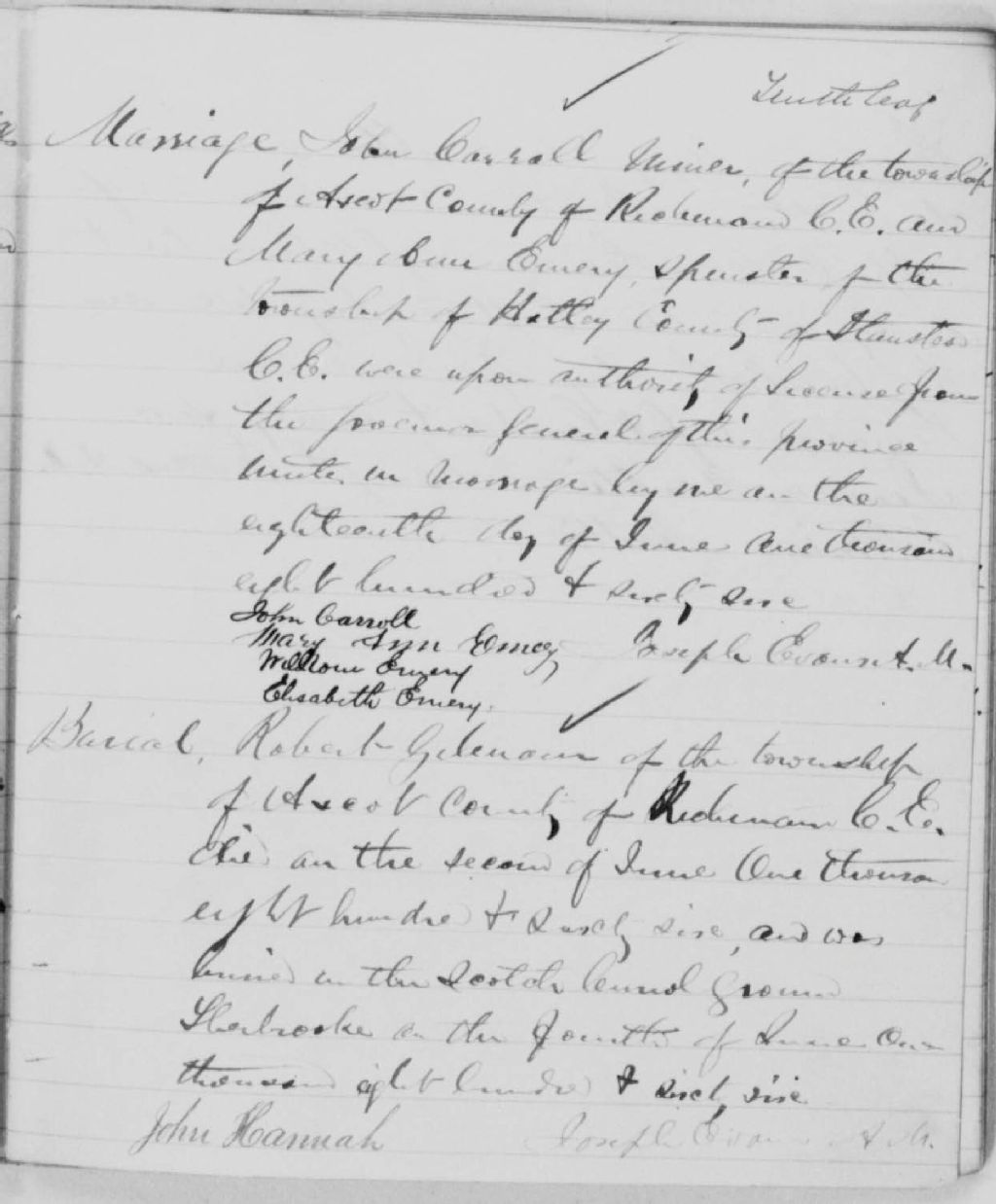 - Cette série regroupe les registres originaux de l'état civil, lesquels contiennent les enregistrements de baptêmes, de mariages et de sépultures consignés par le ministre desservant la communauté de confession presbytérienne de Sherbrooke. On retrouve également, en règle générale, un index nominatif situé à la fin de chaque registre.Les registres couvrent d¿abord le territoire de Sherbrooke et les cantons environnants de Brompton, Compton, Orford, Stoke, Windsor et Ascot.Il est conseillé de consulter les registres de la French Prebyterian Mission of Ditchfield (CE503,S24), une mission francophone rattachée à l¿église de Sherbrooke et dirigée par le pasteur Thomas Charbonnel entre 1883 et 1896.