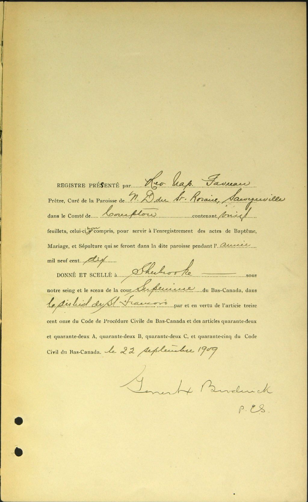 - Cette série regroupe les registres originaux de l'état civil, lesquels contiennent les enregistrements de baptêmes, de mariages et de sépultures consignés par le curé ou son représentant desservant la communauté de confession catholique de la paroisse Notre-Dame-du-Saint-Rosaire de Sawyerville. On retrouve également, en règle générale, un index nominatif à la fin de chaque registre.Pour 1889 à 1892, voir Saint-Camille de Cookshire (CE501,S8)Le registre de 1914 contient, entre autres, des entrées pour la paroisse Saint-Isidore (CE501,S183); ceux de 1915, de 1917 et de 1918 contiennent des entrées pour Saint-Camille de Cookshire (CE501,S8) et pour la mission Sainte-Famille de Newport (qui deviendra la paroisse Saint-Jacques-le-Mineur d'Island Brook). En 1920, le curé de cette paroisse dessert également la mission de Newport et Island Brook.