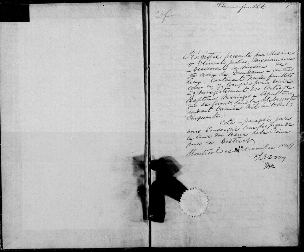 - Cette série regroupe les registres originaux de l'état civil, lesquels contiennent les enregistrements de baptêmes, de mariages et de sépultures consignés par le curé ou son représentant desservant la communauté de confession catholique de la paroisse de Sainte-Croix de Dunham pour la période 1850-1899. On retrouve également, en règle générale, un index nominatif situé à la fin de chaque registre